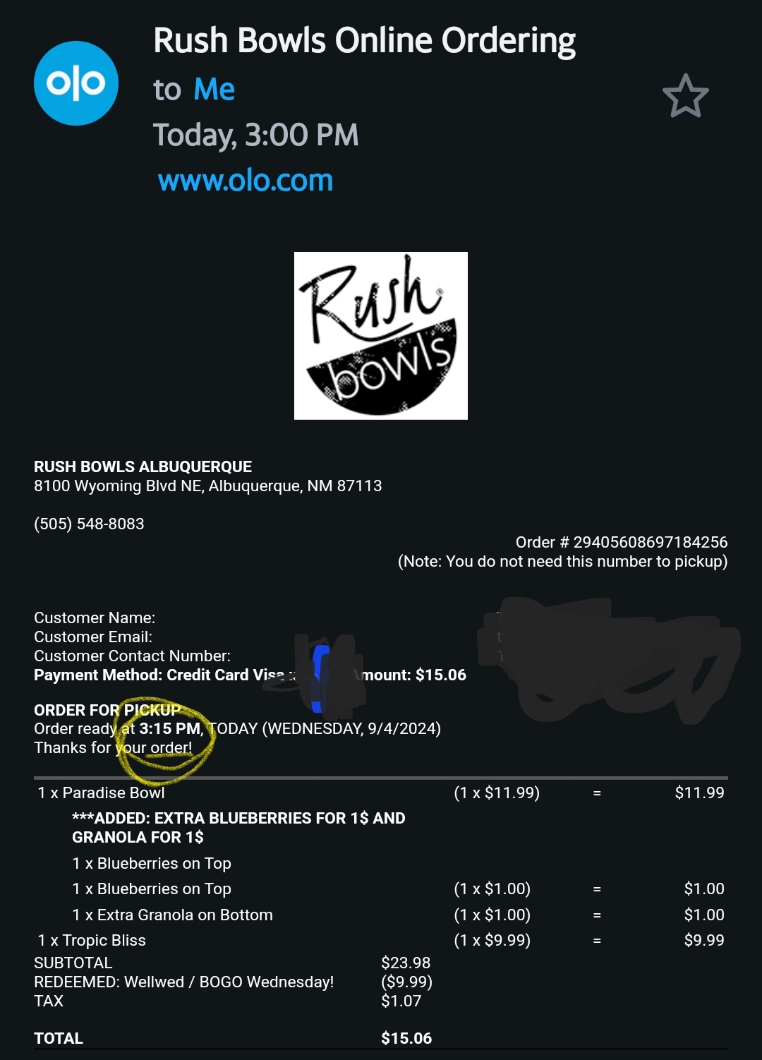 Ordered 8 bowls online for my coworkers at 830am. Website said they would be ready at 8:51. Went over to pickup the order and the employee was extremely rude and annoyed by our “huge order” he suggested we cater next time. As I was waiting for him to complete the order, he would stop making my order each time a customer came in to order. I would sit and watch him make their bowl while Still not completing ours. We use to love ordering g from this place hit after today we will go to another one. Apparently spending a lot of money at this place annoys the employee that has to work. We were not in a hurry and would have showed up whenever the online said to. Some of the bowls were a little Melted by the time we got them (it had been almost 45 mins since the time it said). The melted wasn’t a problem, the attitude of the employee was. I’m not sure his name but he had black finger nails. I how this helps the owner know how people are treated when they...