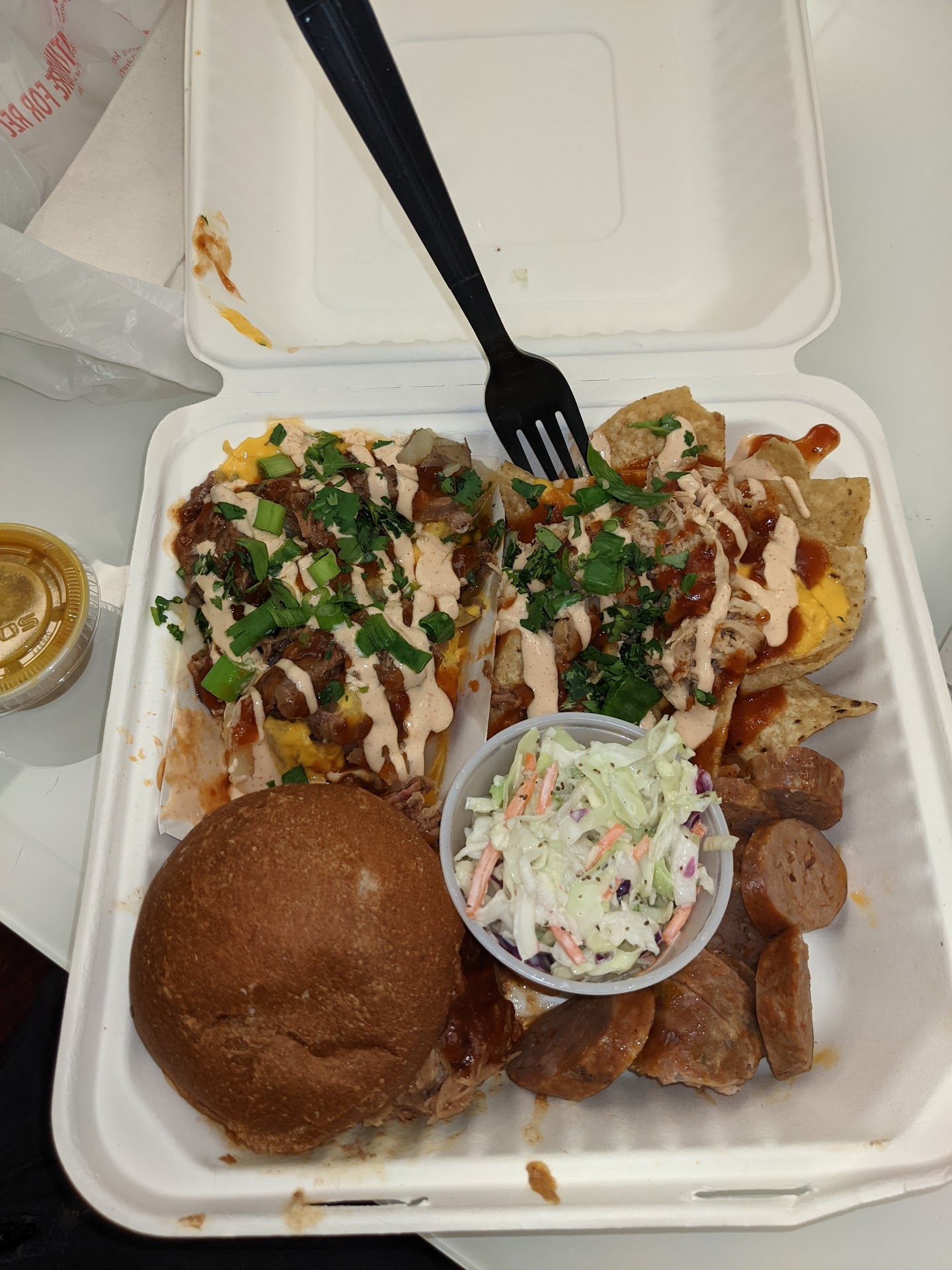 This was our first visit here. The food was outstanding. We had the BBQ sandwich with brisket. There’s different BBQ sauces to choose from, nachos, great sides such as cole slaw, green chile mac and cheese, and things like that. They’re located inside Tin Can Alley. Super fun place! Kid...