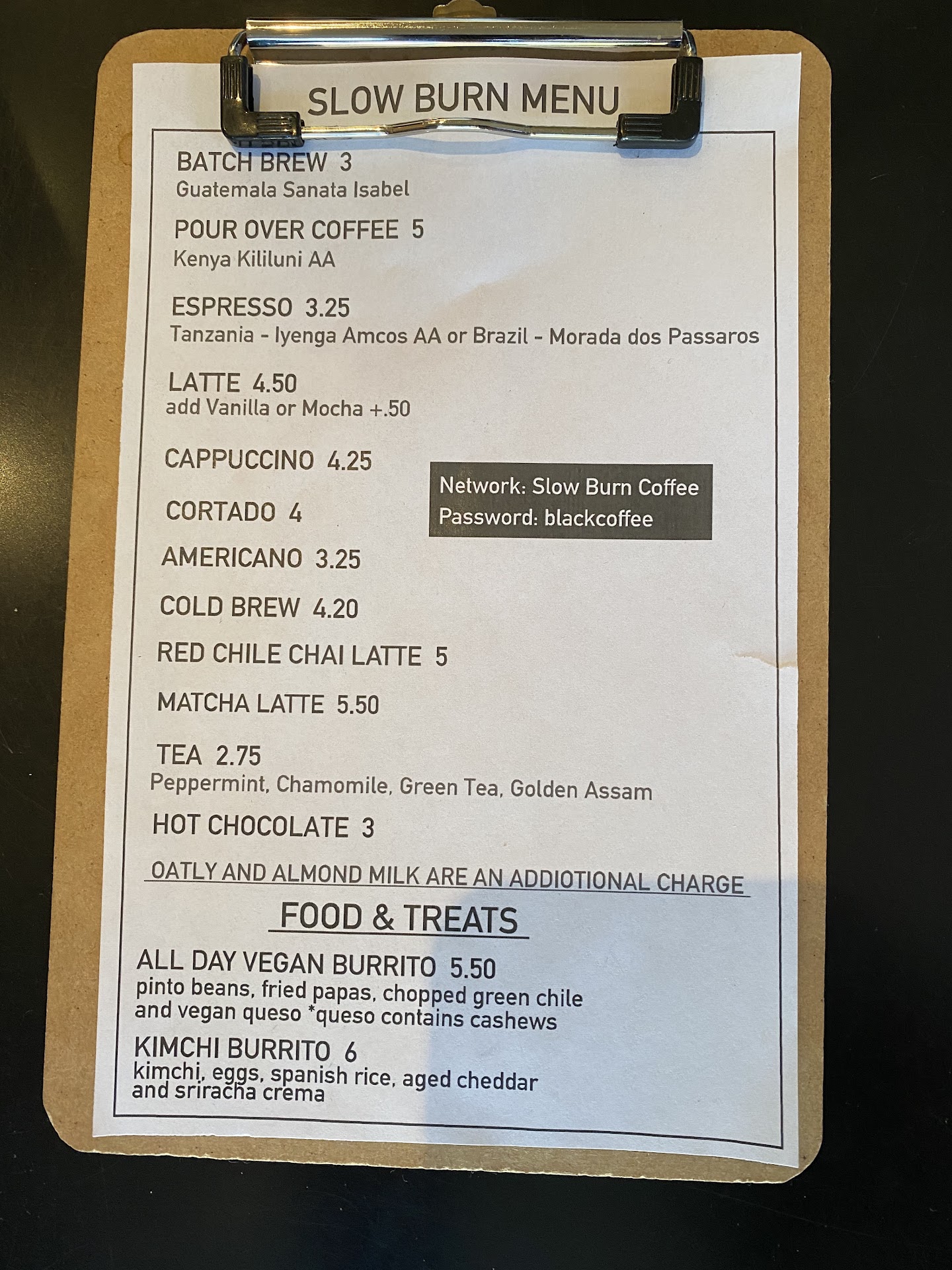 Read moreSo I have gone to Slow Burn quite a few times now. The coffee and atmosphere is amazing. The burritos are also really well made too. I have taken awhile to write my review only because my experience with the baristas/person taking my order has never been pleasant. I look forward to my cup of coffee in the morning because it makes my entire day. Being in the area, I decided to get my coffee at Slow Burn however without fail, the woman getting my order did not smile and almost immediately made me feel unwanted. I try to give people benefit of the doubt and maybe they are just having an off morning. However it’s every time I’ve gone in that the person taking my order is just unwelcoming. The coffee is amazing but it’s not worth the feeling of being an annoyance. I know we all fight our own battles daily and I’m very empathetic to that however it starts to bring down the vibe when every interaction I have with someone there isn’t welcoming. I hope with time, this is something that will improve because the entire...