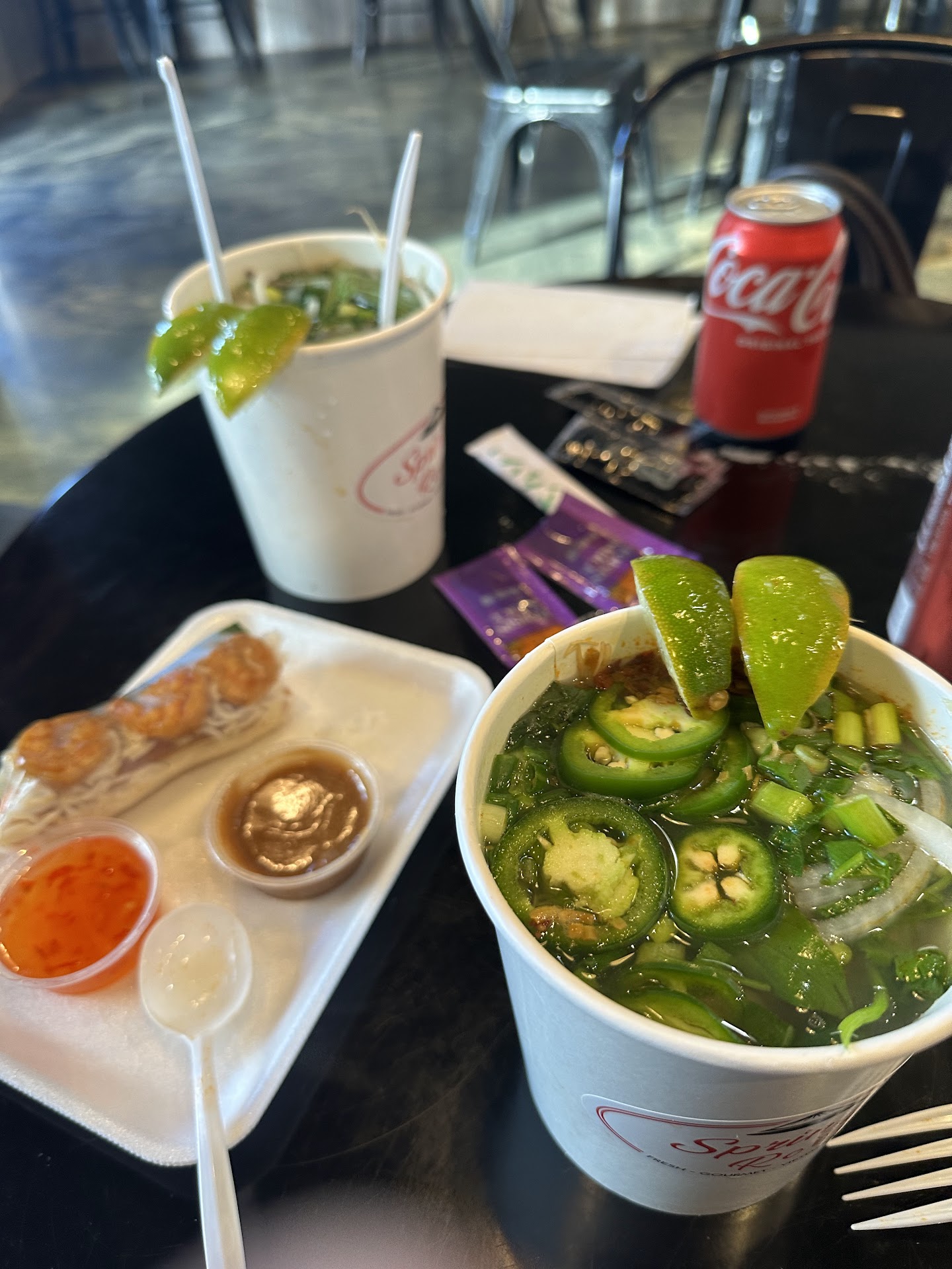 The paper soup takeout bowl for the pho broth was loose and leaky but the employees wrapped it in seran wrap the best they could. Still the lid came off with zero effort. It doesn't seal. They gave the cheapest dinkiest plastic spoons available that couldn't really hold noodles and broth at the same time. Like, dollar store quality plastic spoons, not even grocery store quality plastic spoons. The plastic to-go bag was also the thinnest plastic you could get. The employees were trying to make it more stable for the ride by tying it tightly, but that means it has to be ripped open. There was no way for it to ride flat and stable in the car in this type of bag, and I wouldn't trust the bag to catch leaks and spills. Heck you could barely trust it to hold the weight of the product!