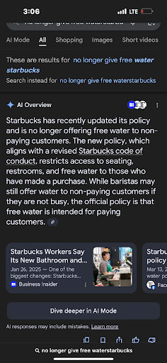 Upon entering the store, I selected a seat to relax and read during my break and then proceeded to the register to request a cup of water. I intended to make a purchase before departing, as has often been my practice. However, I was immediately informed by the barista—identified as Aspen—that water would not be provided without a prior purchase. I expressed surprise, citing my experience as a former Partner and the long-standing commitment Starbucks has had to hospitality and community service. Aspen reiterated that water is reserved for paying customers only.