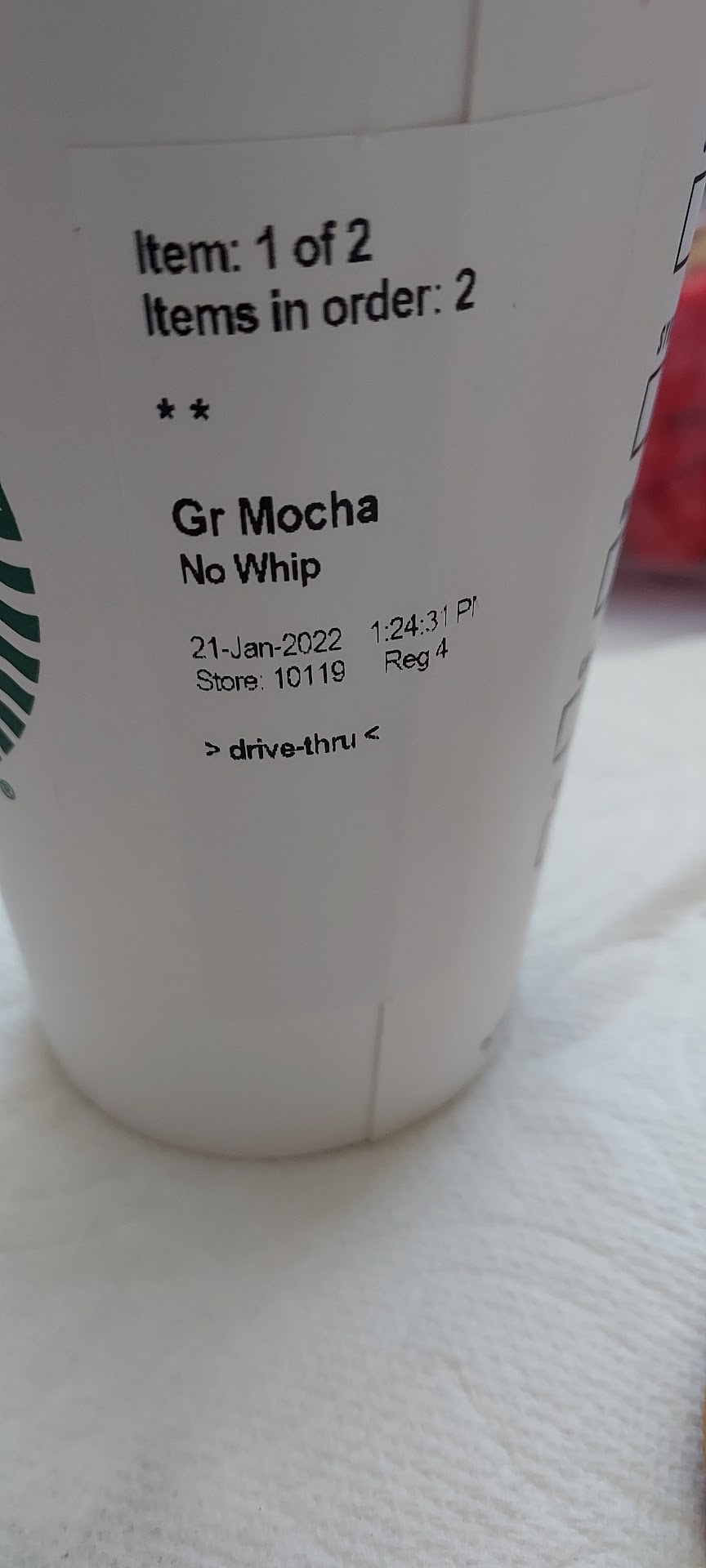 Today, I placed an order for a grande mocha with whole milk, extra hot, with an extra pump of chocolate syrup (my typical order) and a chicken and bacon panini sandwich to go with it. My order was repeated back to me twice: once at the speaker of the menu board and again when I got to the window to pay for it.