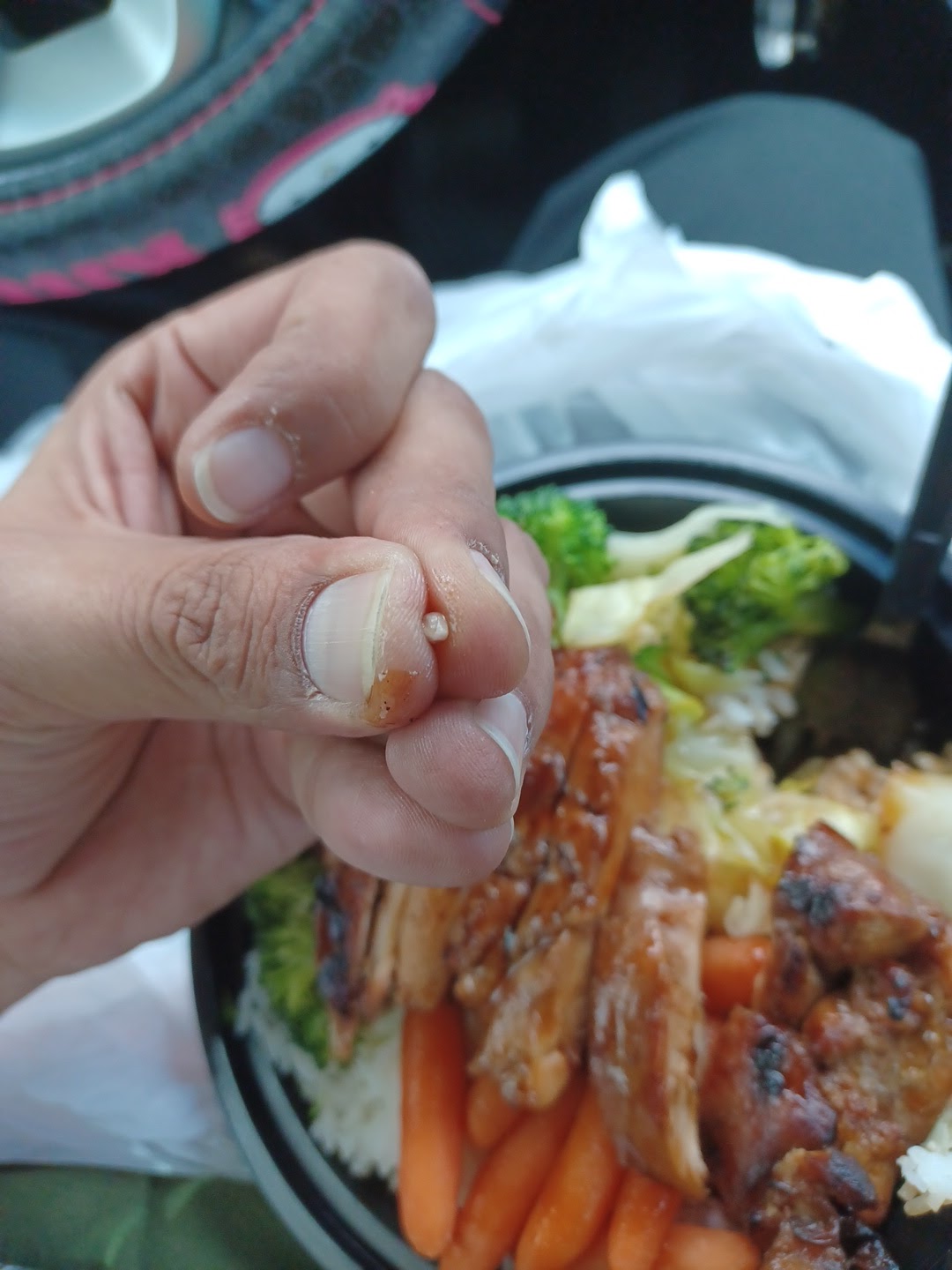Ā Ā Ā Read moreI can't describe the feeling of biting into a small white pebble, but this absolutely **ing sucked. I am showing my fingers pinching it to show that this is not a piece of rice but indeed a small white pebble. I took a few bites. The chicken was good. Broccoli was good. Cabbage was fine and dandy, but as soon as I got to the rice layer, I guess I just got unlucky. At home. I clean the rice out thoroughly to avoid this. Lucky I don't have a cavity or sensitive teeth, or that would have been a dentist visit, along with not finishing my lunch. Throughly not happy. Of course, I'm late from my lunch now to get a cash refund. And wanted the food back, I was like screw it all and gave the bag, napkin, and even an un-drank large coke. The young manager said, "Sorry for the inconvenience." I gave him a thumbs up and drove off. Like, cool, that saved the day or changed the fact I bit into a rock šŖØ or felt like you don't believe a customer. Highly would not...