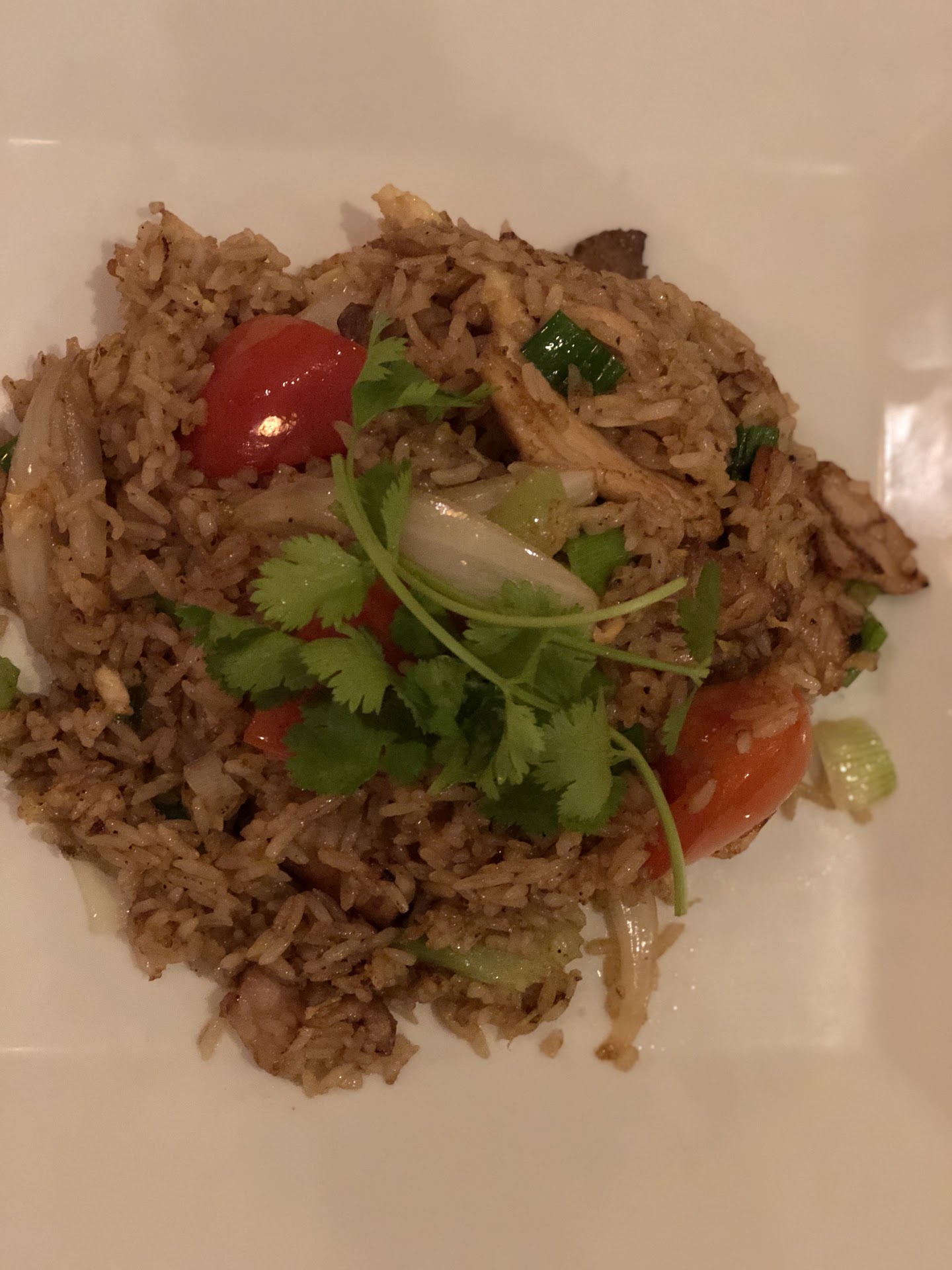 We each had the pineapple fried rice with tofu, medium spice. The onions were cooked but still firm and crunchy, the pineapple was fresh, and there was a nice pile of cilantro on top. The dish additionally had tomatoes, cashews, and green onion. It was flavorful and the spice was complimentary instead of overpowering. The rice wasn’t greasy at all - it was just cooked well.
