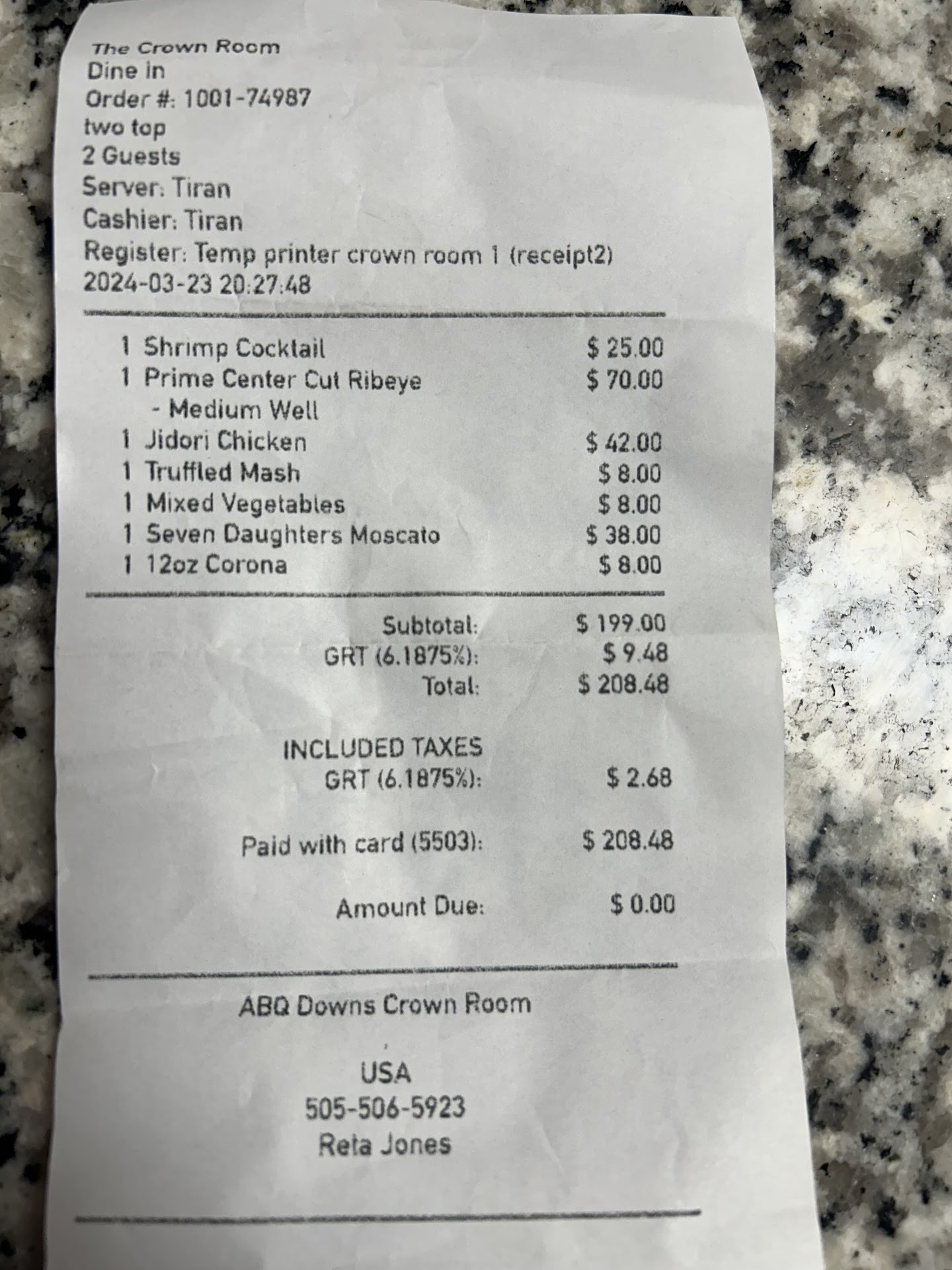 Read moreSilly Me... As a vegetarian for about a year I am starting to learn both the good and bad about eating out with food restrictions. On the plus side most restaurants have at least 1 main dish on the menu that I can eat so I don't sweat it. Then I came the Crown Room and realized everything was made with meat or fish, literally unless I had a side salad and a dessert I would have gone hungry. Fortunately, the staff and the chef were very accommodating and whipped up an orzo pasta with seasonal veggies, an amazing beet reduction, and carrot puree! Next time I go here (or any steakhouse for that matter) I will plan on calling ahead. Thanks for accommodating me and making probably one of the best vegetarian meals I...