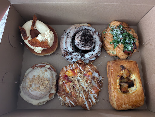 I get home and open my box, taking the obligatory (and attached) photo of my cache, I first select a savory "roasted golden beet and creamy dill danish". My taste buds erupt in a explosion of new and wonderful tastes. The flavor combinations are unfamiliar, unexpected, and so incredibly brilliant that I stand there in awe, making rather grotesque noises at how exceptionally delightful this experience is. The journey comes anew when I then try the "nectarine lemon thyme twist" I also got. The same experience, but also slightly different. A showcase of mastery over other flavors and techniques.