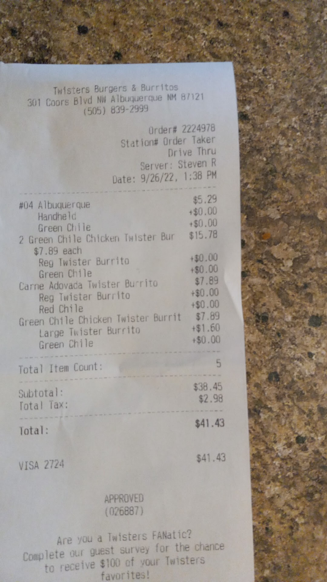 Horrible customer service!!!! I Ordered an XL shredded beef twister burrito Which usually comes with 2 burritos smothered with fries and chili. Well I only received one burrito which was more like a half burrito and a ton of fries. Called this location to notify manager. He asked we bring it back in. So my husband drove back to this location and the manager told him he would put another burrito in box that was already made. He asked the manager to remake order because by then 40-45 Minutes have passed and the food is cold the manager refused to remake order. I have always been a big fan of twisters and go there very regularly but after the service I received I will never return to this location and will probably never go to twisters again. Mistakes happen but the way the situation was handled was unacceptable. Twisters made the mistake and should of gave me what I expected initially which was my extra large shredded twisters burrito that includes two burritos covered with chili cheese and fries fresh and warm!!!! I’m very...