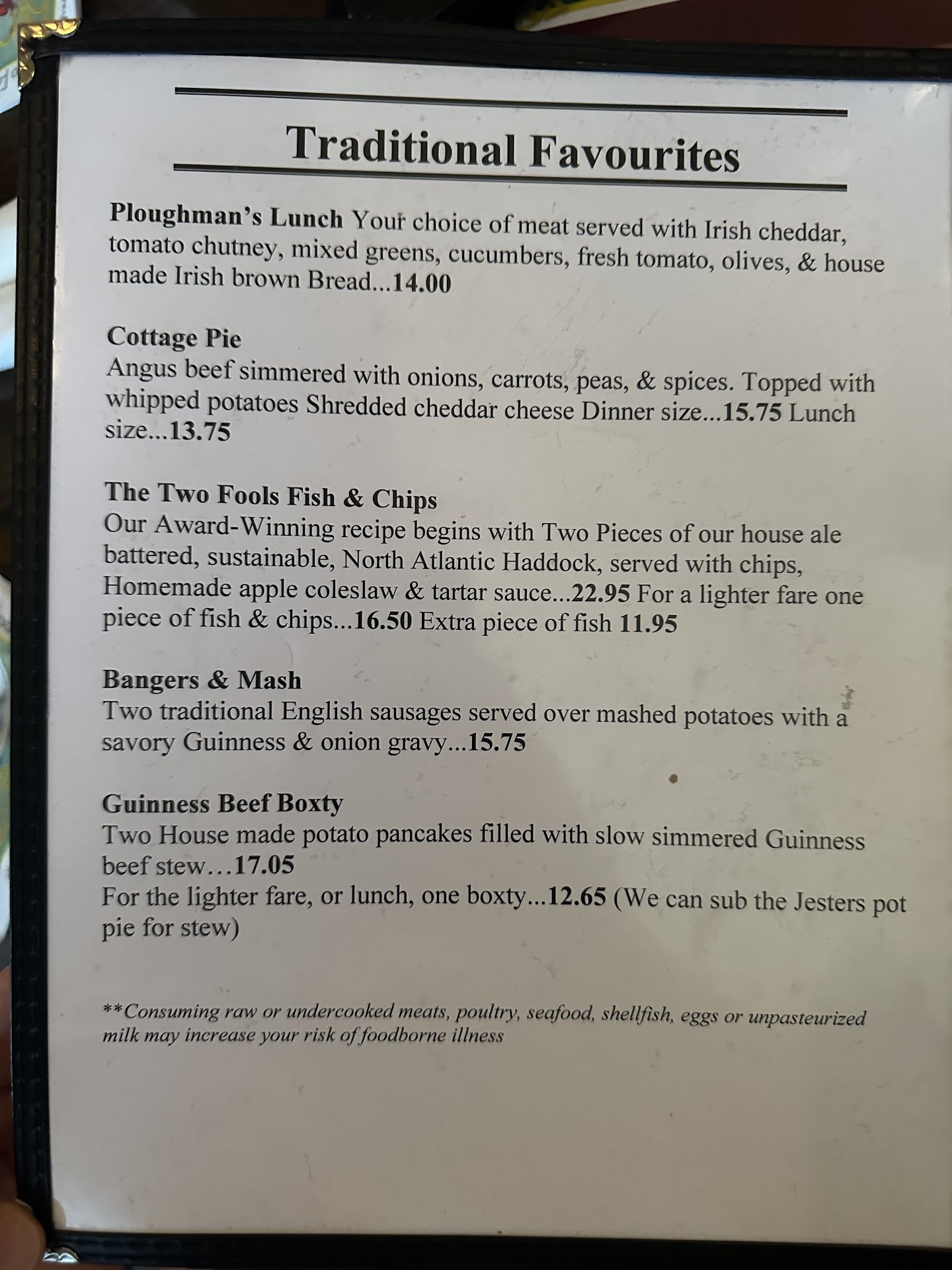 Update: just came from having lunch there. Wow... I haven't left a place like that feeling this disappointed in awhile... It took forever to get service. I think there was only one guy working and all the tables were full. So I get why he took forever to do anything for us. The booster seat must be stored by the kitchen because it reeked of old stinky cooking oil. Now I have to wash the seat cover I always use because it stinks really bad now. I got the Jester's pot pie, I used to love it. It was creamy and delicious. This time around... Idk, it's all crust and hardly any of the juicy pot pie filling I used to love. Smaller portions but the price continues to rise. I decided to try something different and order the chile cheese chips... Ugh. They looked really good when he first brought them but once I started eating them, it was highly disappointing. Literally just a huge pile of fries with a huge chunk of melted/toasted, shredded cheese and some green chile sprinkled randomly around but just on the top. The menu said gooey. It was not gooey at all. It is just an overpriced side of fries. Sat for 30 minutes waiting for the waiter so I can ask the fries be removed. He never showed up. I had to ask another waiter and he said he would help me. When I brought up the issue with the fries, he said, I will see what I can do and be right nack. He came back with the fries still on the ticket and I turned around to ask him to take them off and he was gone. Thank goodness the manager saw me standing up and made it right. I would say that I lost one of my favorite places to eat, but I will definitely go back for fish and chips but not for anything else.