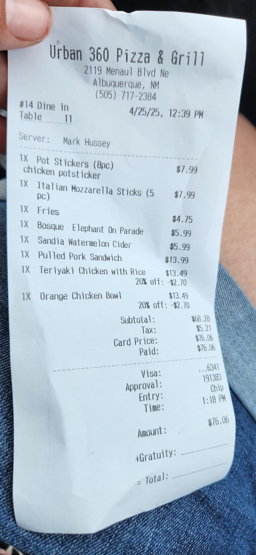 Read moreOrdered a few apps . We love some apps. They were ok, nothing crazy noticed the mozzarella sticks weren't gooey, but that wasn't a deal breaker. We ordered a pulled pork sandwich, teriyaki chicken, and orange chicken. Since the kids 6 and 4 didn't want pizza and I won't eat a pizza alone. Got our plates and the presentation was nice but once I took that first bite of teriyaki chicken something was off, I was sure it was just me and asked for saracha sauce figured I just needed some spice but nope. Then my husband got his sandwich, and the kids got their plate. They went for the rice per usual 😒. I stole a piece of their orange chicken and had to spit it out. My kids ate the rice, and I ate the rolls since I was trying not to say anything. Finally, I ask for the check and let the bartender/server that the meats on our food, including our sandwich, are unedible. The only way I can describe it is either going bad or freezer burn. The guy tells another guy who had been sitting at the bar the whole time (I guess), and I can hear him say someone ordered earlier, and it was fine. He comes back with my card and receipt and tells me he took off 20%. I let him know i wasn't looking for a discount, just letting him know that was plain not edible. But what really pissed me off what the way they wrote it off. Hope nobody gets sick off this place. I won't be back. Also, the 4 dollars off is a joke. I might as well...