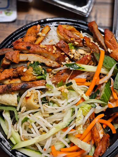 My banh mi was fairly good, but there was little care taken in the bell pepper prep. I had two big slabs of bell pepper on the sandwich, not a proper julienne. Come on. Take a tiny bit of care and pride in your work. Also, I had a huge thick stem of cilantro on my sandwich was not something that can be cut with teeth. It was that thick of a stem. Again, take some pride in your work. There was very little veg in my sandwich at all, just the poorly prepped bell pepper and the also poorly prepped cilantro. Hardly any cucumber or Äá» chua (pickled carrots and white radish) to be found at all. When I got to the second half of my sandwich, I got SOOOOO much chile in one bite it was ridiculously hot and not pleasant at all. What is wrong with you? Why would you do this? And finally, the last inch and a half of the sandwich had no filling on it at all. My husband ordered the lemongrass chicken banh mi. He had about the same assessment. Not enough produce, but again the poorly prepped bell pepper. Some veg is fine and prepped well. some is huge-a$$ pieces of random veg (bell pepper and cucumber), huge pieces of cilantro stem. AND the huge hit of chiles in one or two bites. Unacceptable. Our noodle bowls were both ok, but again with the poorly prepped veg. Even the ones that were uniformly sliced, the julienne was far too thickly sliced. My husband's grilled pork was rather dry.