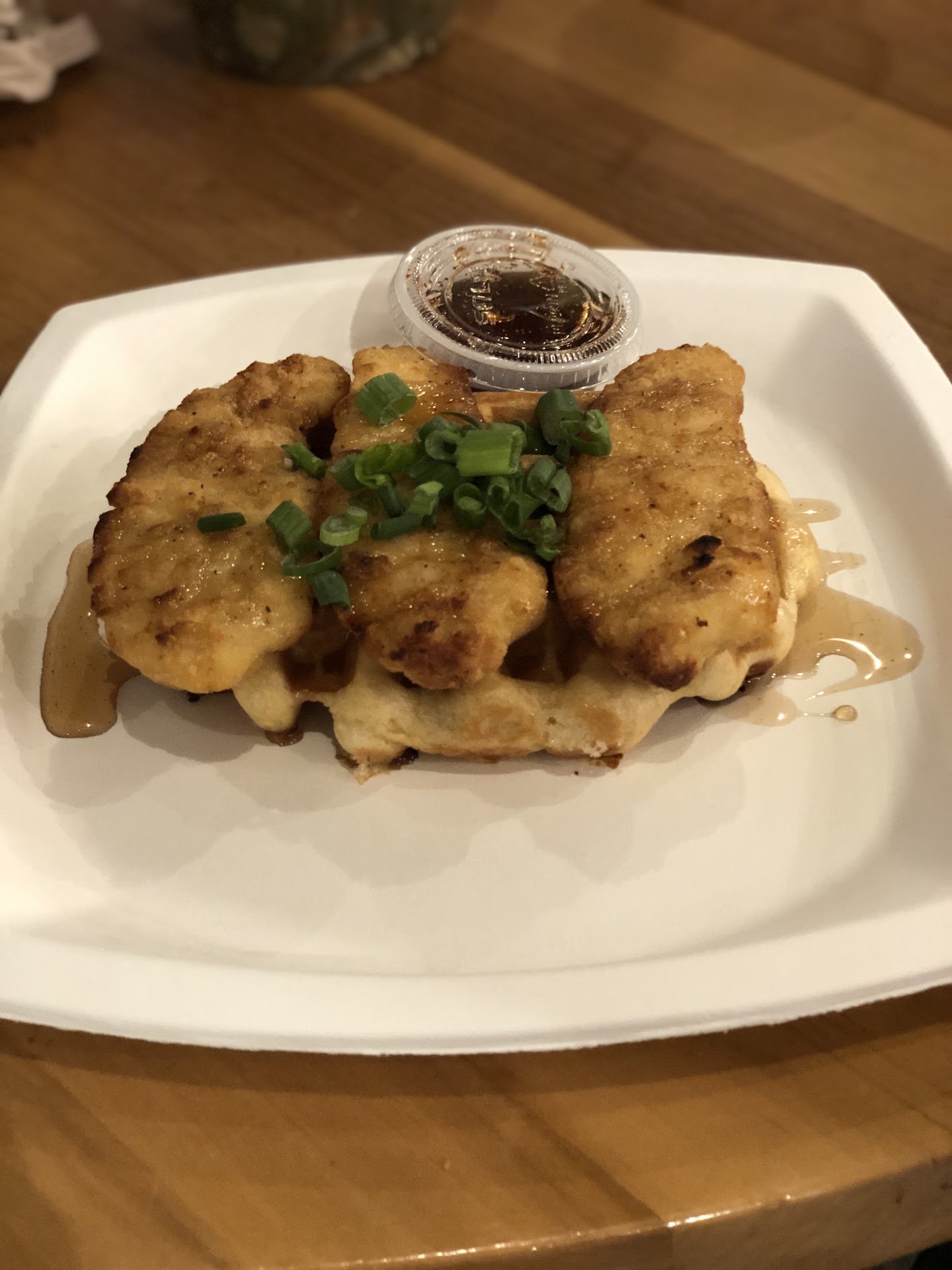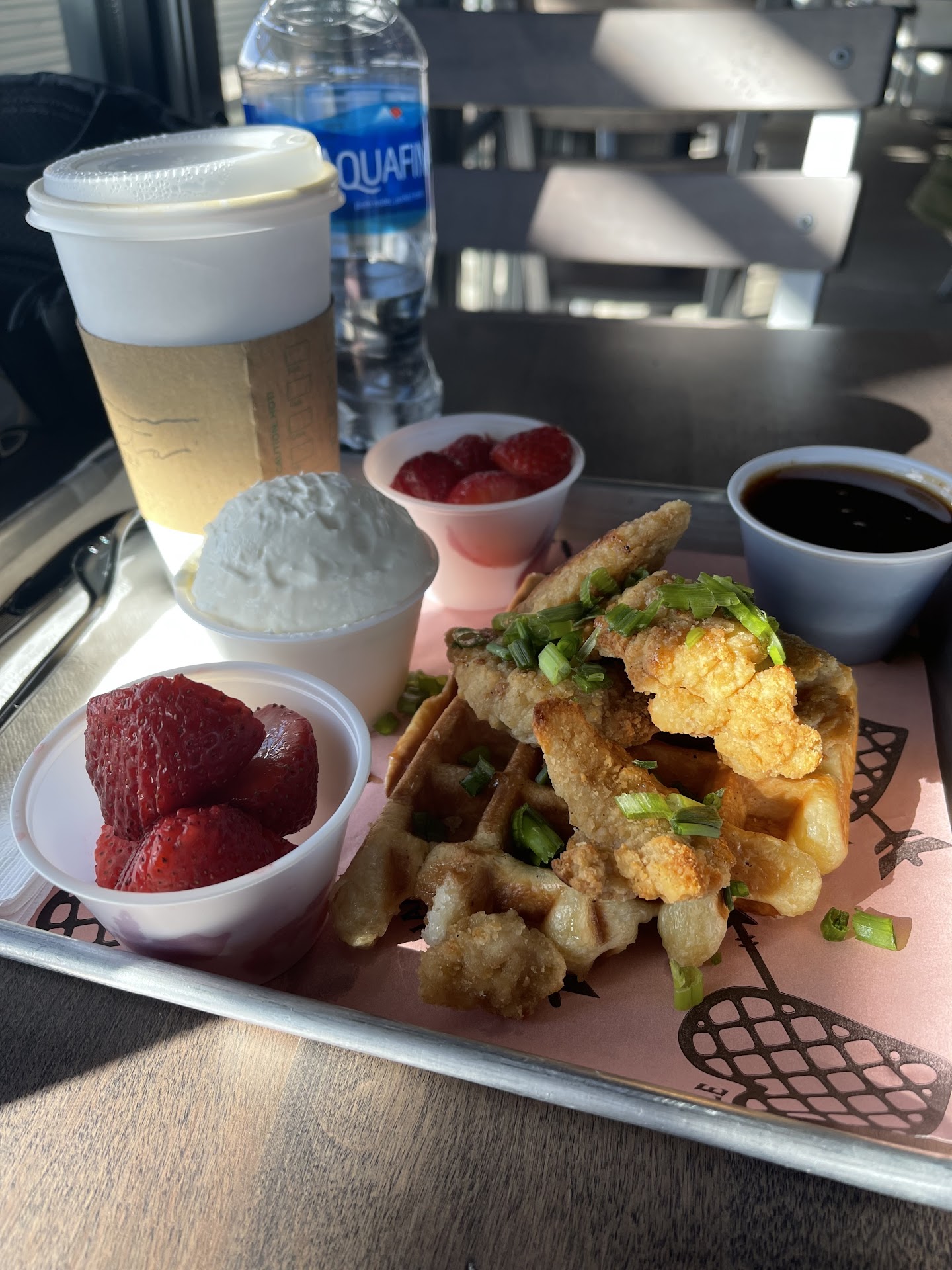 I ordered the chicken and waffles with green onions and spicy maple syrup. I don't believe that I received spicy because it had absolutely no bite. There also wasn't enough syrup; the waffle was small, pretty tough and dry, and it didn't seem freshly made. The two chicken strips were tasty, but they looked like typical frozen chicken strips from the grocery store that were just warmed up in the microwave, rather than deep fried on site. My husband had a waffle with strawberry sauce and whipped cream; he was much more pleased with his meal because the toppings softened up his waffle more than mine.