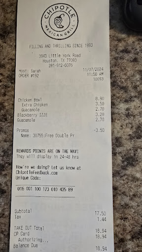 Read moreGiving Chipotle in general 2 stars because of their false advertisement on app regarding Guac. I ordered the Salad bowl and the app clearly says "Guac Included for the $9.25". I took a screen shot just to have as proof. Even the screen shot shows "Chicken Salad". If it's included then why are they charging me for it. So today go In Person, order the exact Salad as in app and this store where I'm putting review charges me for a Regular Chicken bowl and not a "Salad Bowl". Receipt also shows them charging the GUAC but on the Chicken Bowl and not Salad bowl. Yeah I paid for extra because they also cheap on it. SMH. Chipotle needs to get their crap together and stop ripping people off. Managers need to PROPERLY TRAIN their employees also. A reg Chicken bowl is not the same as the Salad Bowl. If it was, then Chipotle would only have ONE...