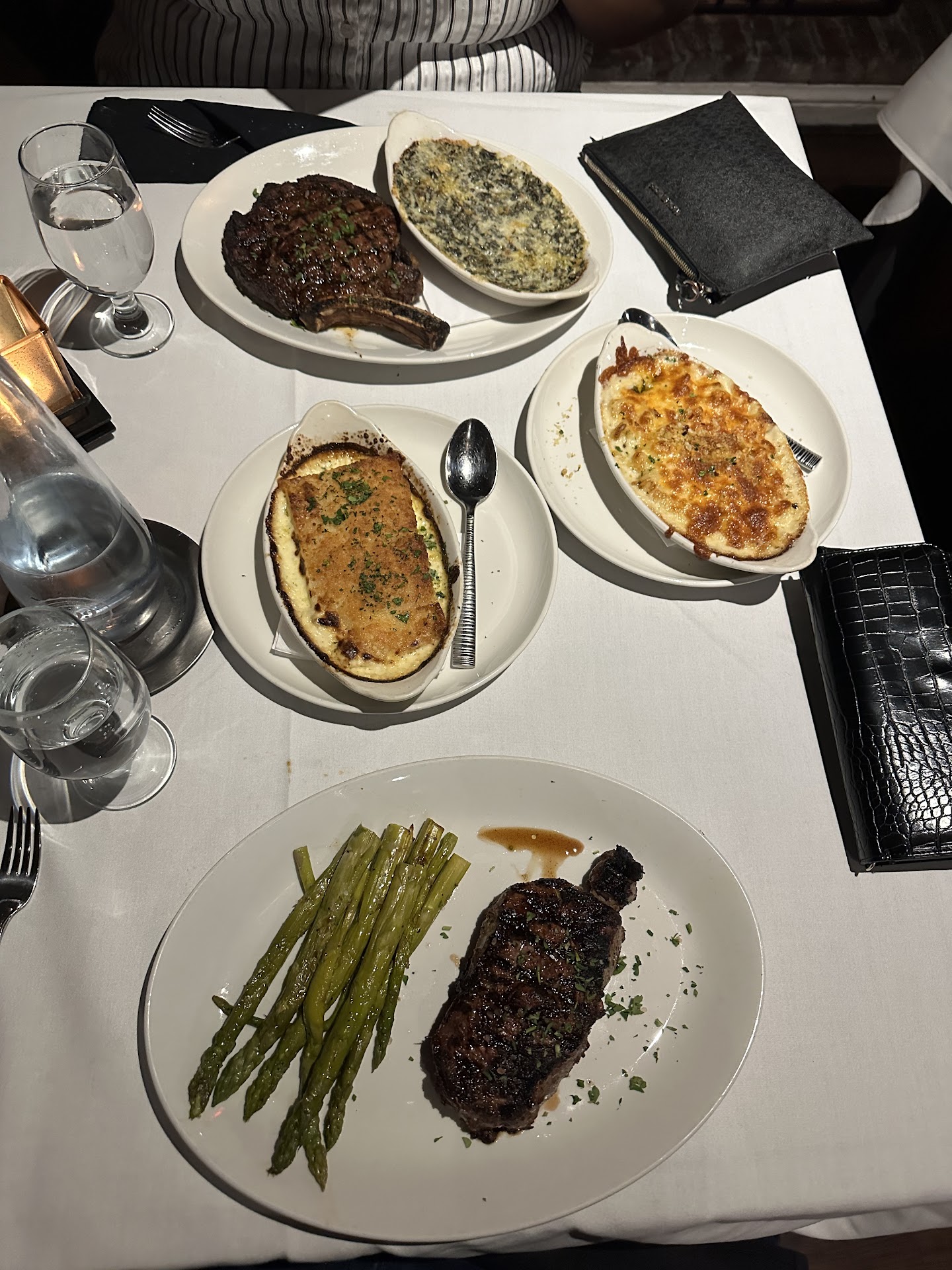 For our entrees, we ordered the Prime New York Strip and Prime Bone-In Ribeye. While I elected to keep the grilled asparagus that the New York Strip comes with, my friend exchanged hers for creamed spinach. We both added an additional side; I ordered the potato au gratin and she ordered the macaroni and cheese. The potato au gratin was not in the style Iâm used to. My friend enjoyed her creamed spinach and macaroni and cheese.