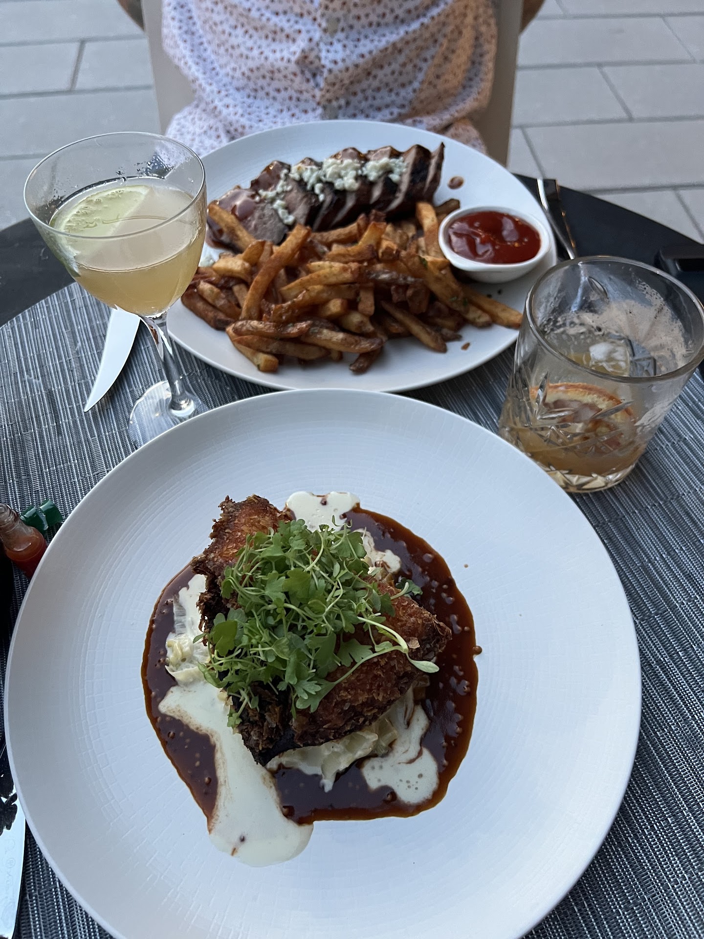 For starters, we got the Roasted Sweet Corn Chowder and the Peaches and Prosciutto Toast. The soup was relatively thin for a chowder and had a heavy flavor of dried herbs, which gave it more of a home-cooked dish feel than an upscale course. The Peaches and Prosciutto Toast was tasty, but unoriginal.