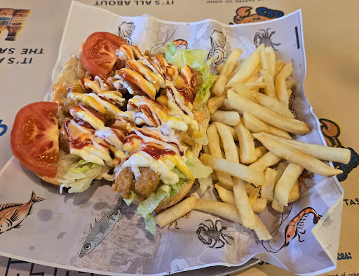 My partnerâs po boy was a bit of a mess. The bread was untoasted and stale. Even if it hadnât been stale, the lack of texture made it unable to stand up to the glut of sauces that had been poured on top of it. We could barely see the shrimp, lettuce, and tomatoes underneath for all the stripes of mayonnaise, ketchup, and whatever their pink house sauce is.