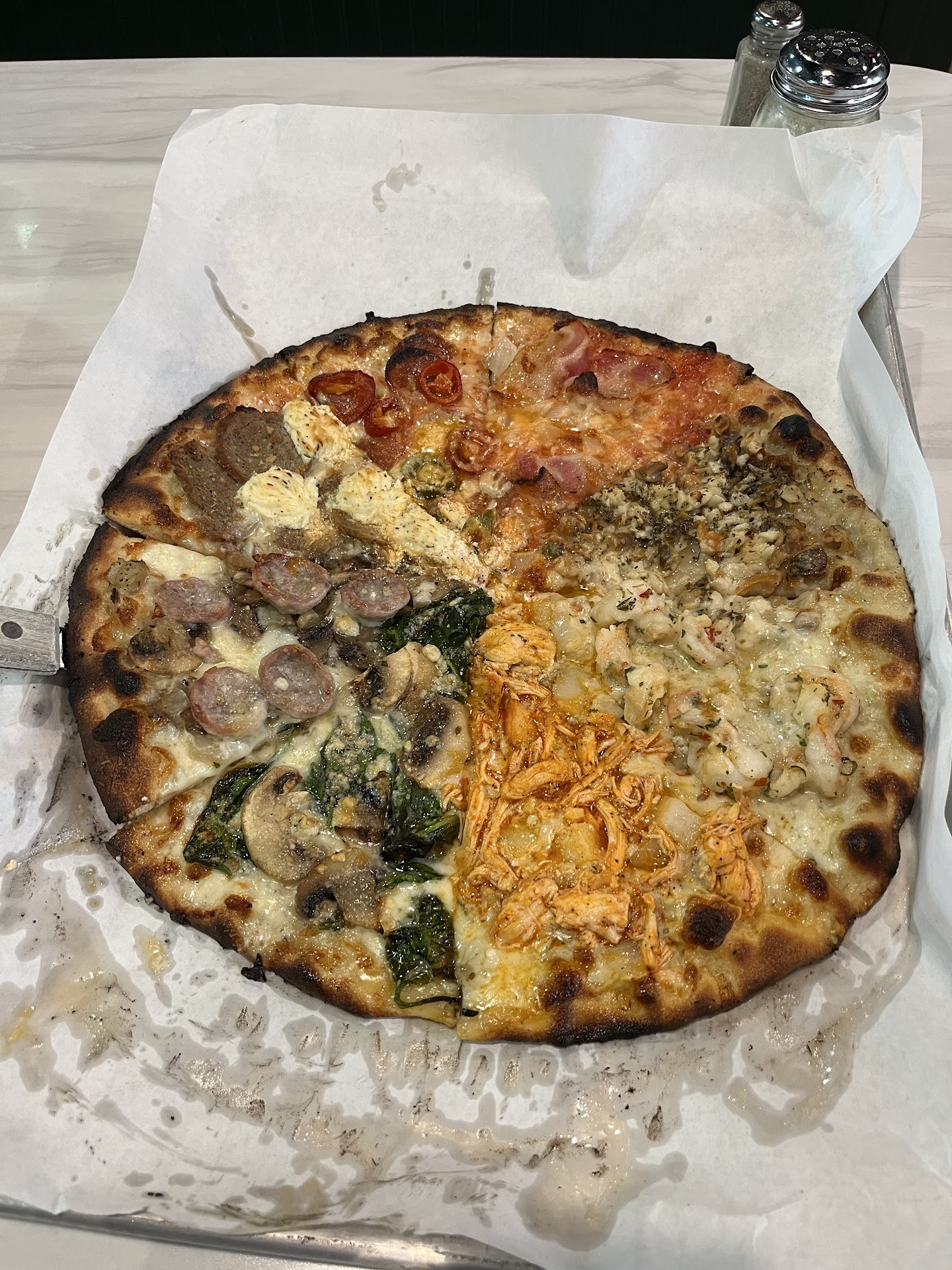 Ok so going to be fully transparent and honest with the review, which is how they should be. I went here today with a buddy based on a recommendation from his friend. I ordered a large pizza (18â) 1/2 tomato and cheese and 1/2 pesto, pepperoni, cheese, and onion. I have been making a lot of homemade pesto pizzas recently and like them so I wanted to try theirs. The pesto was in the toppings section disclosed as a topping. However I explained what was my interpretation and explained I would take just the pesto sauce and no tomato sauce as I thought it would be a pesto sauce on the pizza. Nobody explained it to me that it wasnât a pesto sauce I was adding. It says pesto as an option for toppings. Here is where the problem started. Maybe I should have known it wasnât a sauce because it was listed under the toppings section? Had the waitress explained it isnât a sauce, I would have changed my order but maybe she didnât know either. What I got was a plain bread w cheese, pepperoni, sausage, and onion. Apparently they drizzled some pesto (oil maybe?) but there was zero pesto as far as taste. There definitely wasnât any recognizable pesto as a topping. There was zero as far as I could tell. They said it is a drizzle, which I guess means an oil? I was pretty disappointed and explained that there wasnât pesto on the pizza. The waitress was starting to offer to cook another so I thought that was fair and reasonable. Then a manager (?) came over and said I heard the pizza wasnât to your liking. I told it wasnât that it wasnât to my liking it was that it wasnât what I ordered. He said he would take the $2 charge off the pizza as a topping. He didnât try to hear what I was saying. I was communicating clearly but the dismissal of it or lack of effort to remedy the situation is entirely why I am giving this 3 stars. Had he made any bit of effort to understand I would have been satisfied. I communicated as I was leaving who cares about $2 off a $40 pizza? Maybe the pizza was $35 but the point is the same. With that being said had it been a pesto pizza I think it would have been excellent. The bread is excellent and was cooked perfectly. I did take the leftovers home, heated it up with a proper pesto sauce and it was great. I would recommend this pizza place, although expensive, but the pizza if you get what you order is very good. I also ordered a $8 Cesar salad and it was ok. Way too little for $8, but it was okâŠnothing great so I would stick w just...