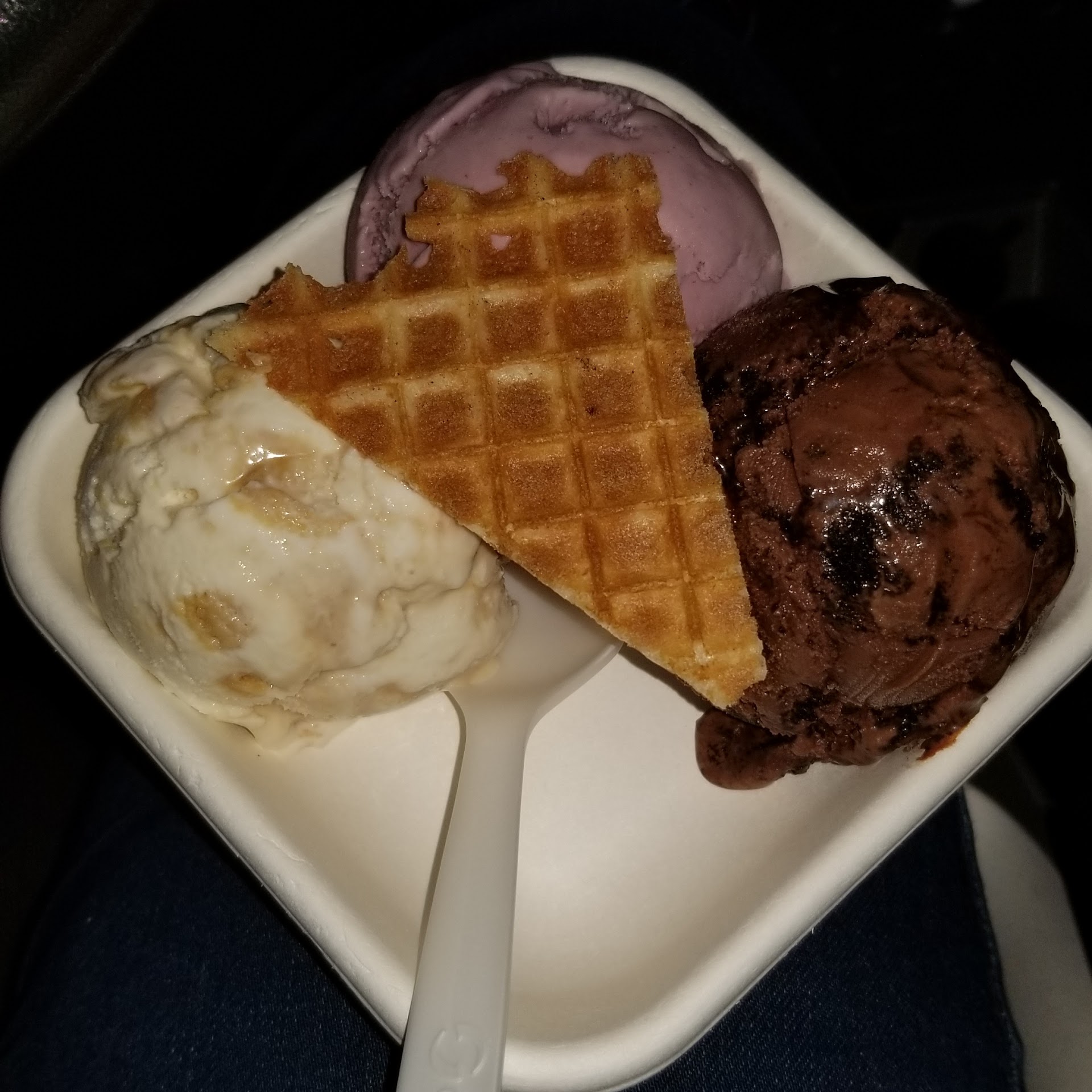 Since I ordered a trio, there were three half scoops together. For some unfathomable reason, they put the lavender in the middle, which of course tasted disgusting when mixed with the chocolate. It's just common sense that the most neutral flavor (in this case, the butter cake) belongs in the middle.