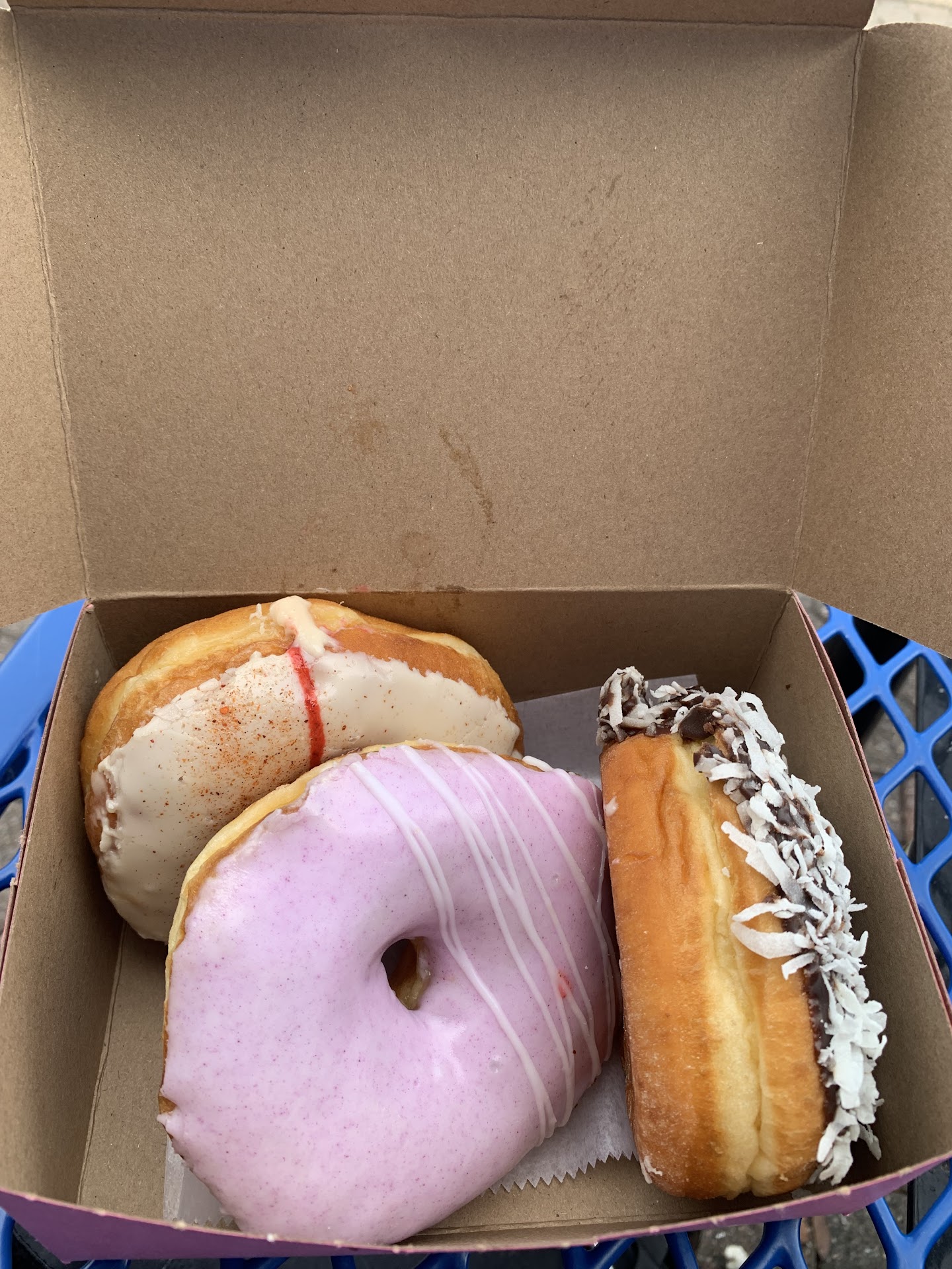 The mango tajin did have a not-too-sweet jelly filling that was perfect and frosting that could have done with a little more tajin. I was as disappointed as I could be while still being very content with the ube donut -- the frosting lacked any distinct ube flavor but there was not so much of it resulting in an overall positive experience. The chocolate coconut...