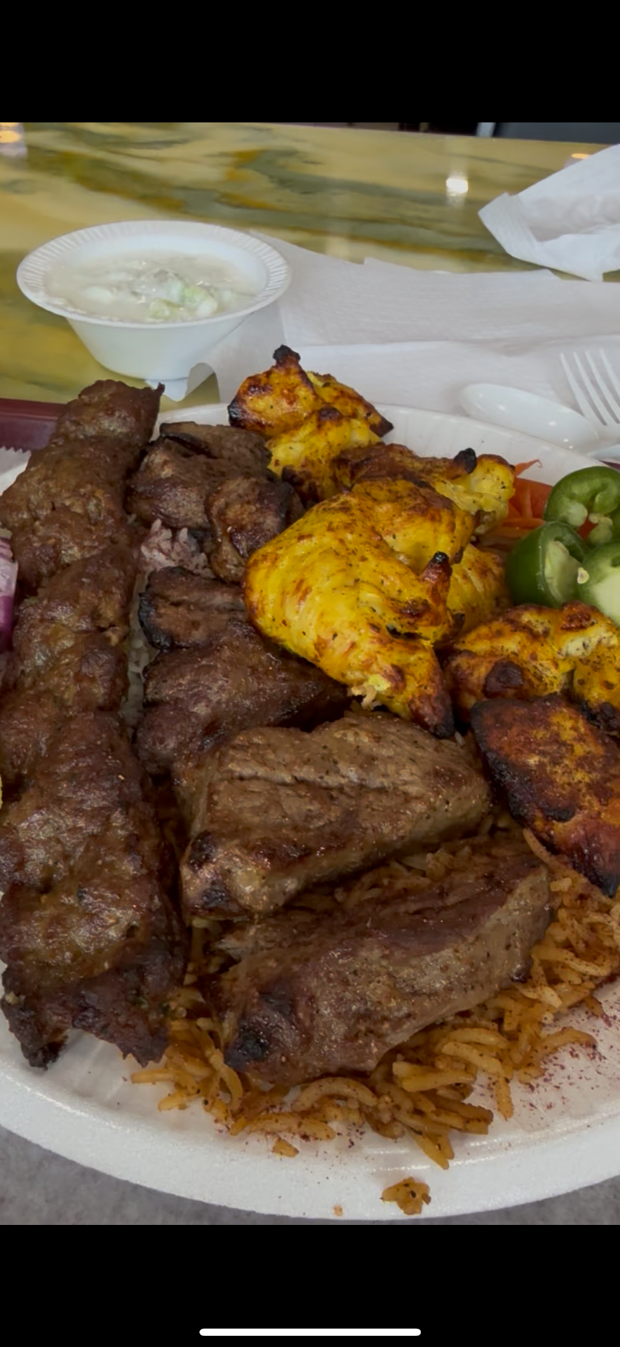 Read moreI'm stunned. I've never left a review before, but Kabul Kabob may as well have spit in our faces. Having ordered a lamb and beef rice plate ($42.70) we proceeded to wait 22 min for food that we expected take 15 min maximum - few others were inside and there were 4 men in the kitchen. This would have been fine as the decorations were well and the cashier was hospitable enough. But the food given was subpar. The chickpeas had no kick or flavor, just slop compared to any kabob place i've been to in the nearby area. The meatball was horrid and in a container with flavorless potatoes. The rice had no spice, only oil if anything. But the worst part: after having nearly left the parking lot before discovering we had no sauce, I went back to get some but came to find out that the white sauce was just mayo. I've never been so disgusted! The green sauce was lazy, only tasted of lemon, but bearable. Only the beef itself was salvageable. I really hope this place isn't this bad on the daily, but my experience with Kabul Kabob was horrified. There are plenty of nearby spots, no need to come here and waste your money and time...