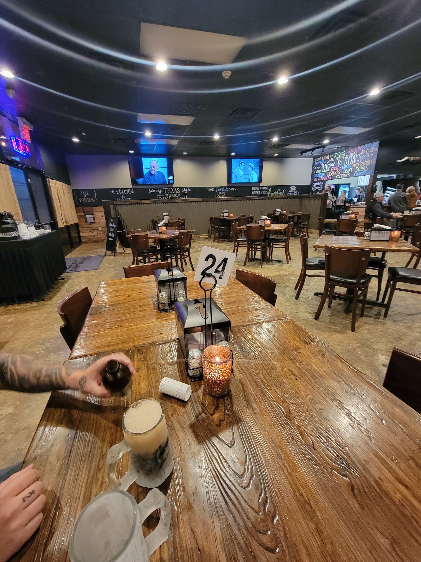 Read moreWent today for lunch because my little girl begged me to take her to Koal's so she could try their ribs. Her ribs were pretty fall off the bone. She enjoyed them so that makes me happy. What I'm super disappointed in was the $22 Blackened Salmon Salad I got. It was a pitiful excuse for a salad (they spread it onto a medium sized dish but it's about the size of a side salad elsewhere if you were to serve it on a smaller plate). They make NONE of their salad dressings in house. On to the salmon, it was cooked almost perfectly BUT it had ZERO seasoning on it. Zero. I added salt and pepper at the table and drizzled a little of the balsamic dressing onto it. For that amount of money, I have higher expectations. That is a high end restaurant salad price for a mediocre meal. I also received a large end of lettuce on my plate...editable!! When asked how everything was I was honest. The nice, older man gave me a free dessert for my next time in. He offered to have a new salad made but I didn't have time to "wait a bit" for it. The gesture was kind though. The girl expediting...brownish hair, excellent personality and light-hearted sense of humor was amazing!! Keep her because she's a gem. The blonde behind the register was nice enough...could smile and greet people when they come in. I'm in the service industry, I own my own business...soooo Koal's improve. Alexandria needs good restaurants that can stick around. AND that salad isn't a $20ish salad. Sorry...just not! Great job on the ribs!! Very clean restaurant. 👌 This was my second time in...I waited a year in between. Both not top notch...