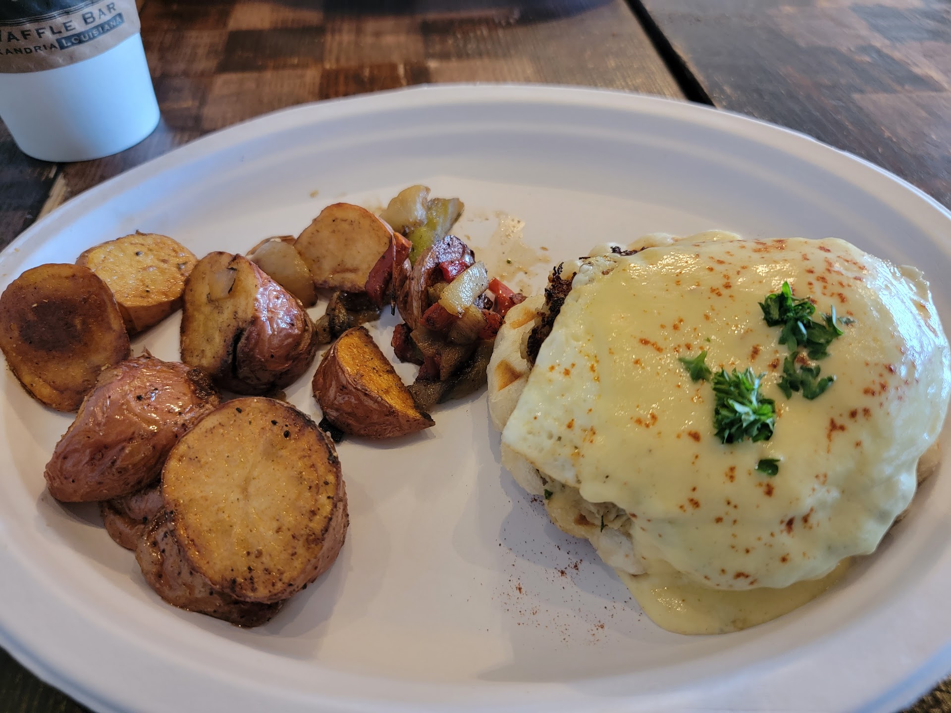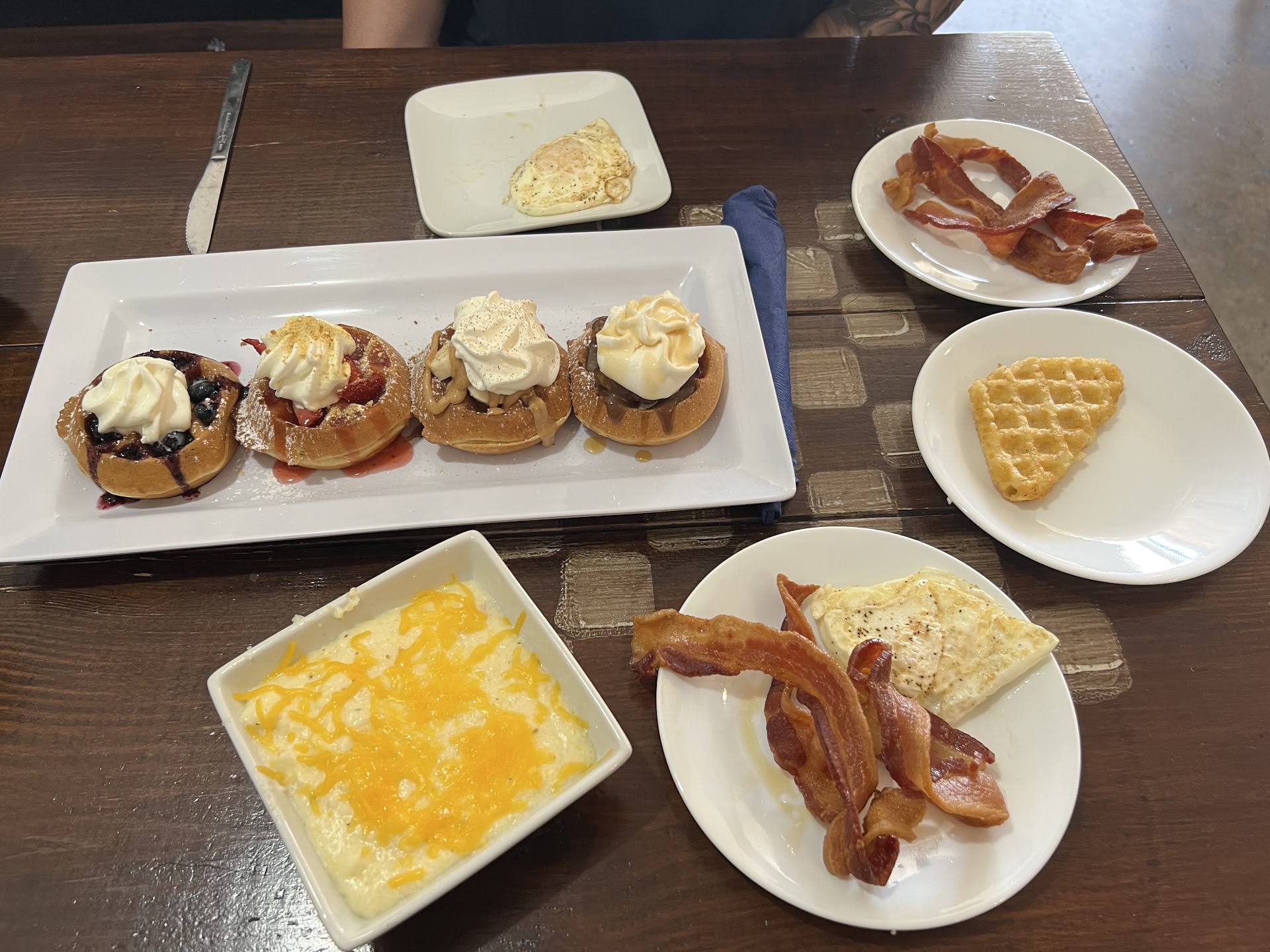 The concept is great and the restaurant decor is really funky and kind of laid back cool. The coffee is good. My biggest issue with the restaurant is the food well my food. My niece had the strawberry vanilla waffle and she loved it, it was light and very tasty. To my food, I got the build your own Benedict, this is dish that should be easy for a restaurant focused on breakfast foods. The touch of using waffles instead of English muffins is a novel idea but the waffle should be freshly made, not like mine which was not even warm. Maybe I should have been wary when asked how I wanted my eggs cooked, traditionally Benedict eggs are poached, the menu called their Benedict dishes traditional so I said runny. The menu specifys two Benedicts with your choice of protein, for an upcharge, when the plate arrived at the table it was a disappointment. The bacon was the precooked type that you just need to warm up. The accompanying salad was just baby greens, no dressing, with a garnish of grapes, two lone whole grapes. The Benedicts or should I say Benedict was covered be Hollendaise sauce that was tepid just warm enough to pour over the Benedict, if the sauce wasn't from a packet I will be very surprised. The next surprise or disappointment was the egg, it was fried. Not poached, as Benedict eggs should be but FRIED. The surprises didn't end there, there was only one Benedict, I paid for two and there was only one. Now, I should have said something then but by this point I didn't care, the staff obviously didn't. There was no seasoning to the Benedicts no salt, pepper, lemon juice nothing. The restaurant is a interesting concept and if you stick to the waffles you are probably going to have a really good waffle but if you stray off the easy parts of the menu you are going to take a risk. The prices are more Vegas than Cenla, brunch for a family of 4 will put a dent in...
