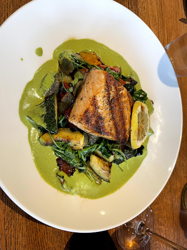 Ā Ā Ā Read moreI made a reservation on their website for dinner tonight to celebrate my father-in-lawās birthday. There website is pretty easy to use to schedule a reservation. The atmosphere is nice with a pleasant wood fire smell. The food here was also delicious! I ordered the Whitehaven Sauvignon Blanc and Nordic Blu Salmon. My husband got a Bison Steakhouse Burger. My father-in-law got a Michelob Golden with Pork Chop. Everything tasted phenomenal and the salmon that I ordered was really good with the green sauce that it was served with. I finished my meal in a heartbeat!