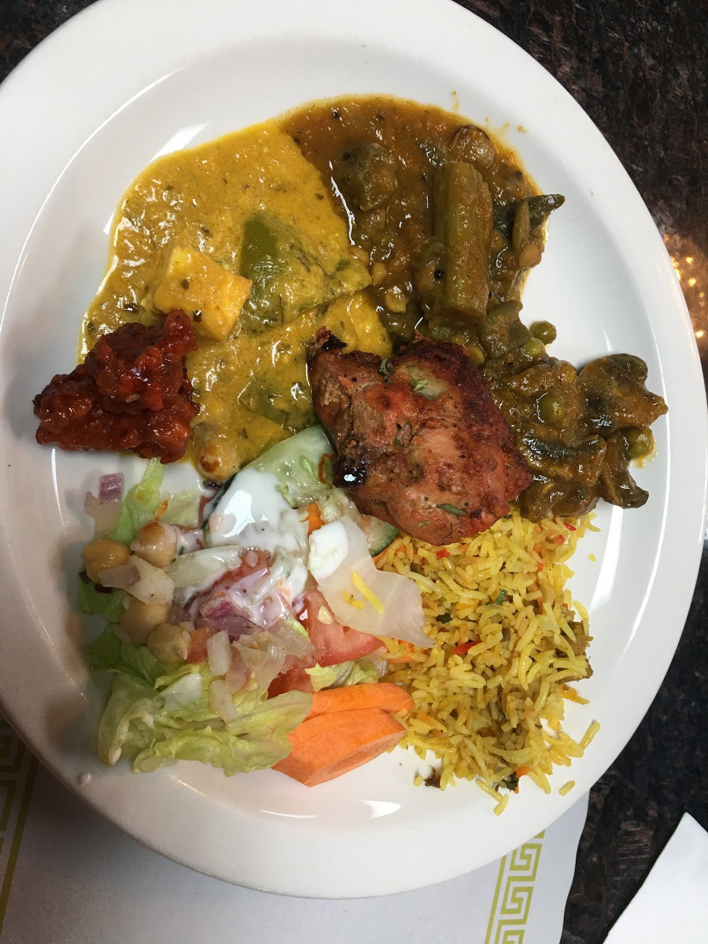 We made a mistake (our fault, not theirs) and misread the items that came with the Thali. My wife had previously been to Namaste Jalsa and was excited for me to try it because of my love of Indian food. She loves their Paneer Tikka Masala (which, again, I make) and insisted I try it. We thought a portion came with the Veg Thali, but, again, we misread the list of included items and it is not one of the items that is included. We did not complain because we made the mistake and I was happy to have such a variety. I was literally like a kid in a candy store. But, sensing her disappointment, the staff brought her a sampler size portion of the Paneer Tikka Masala. She was right; it is one of the best I have ever tasted. It was bright and vibrant. It was a very kind gesture by the staff and it made her night.