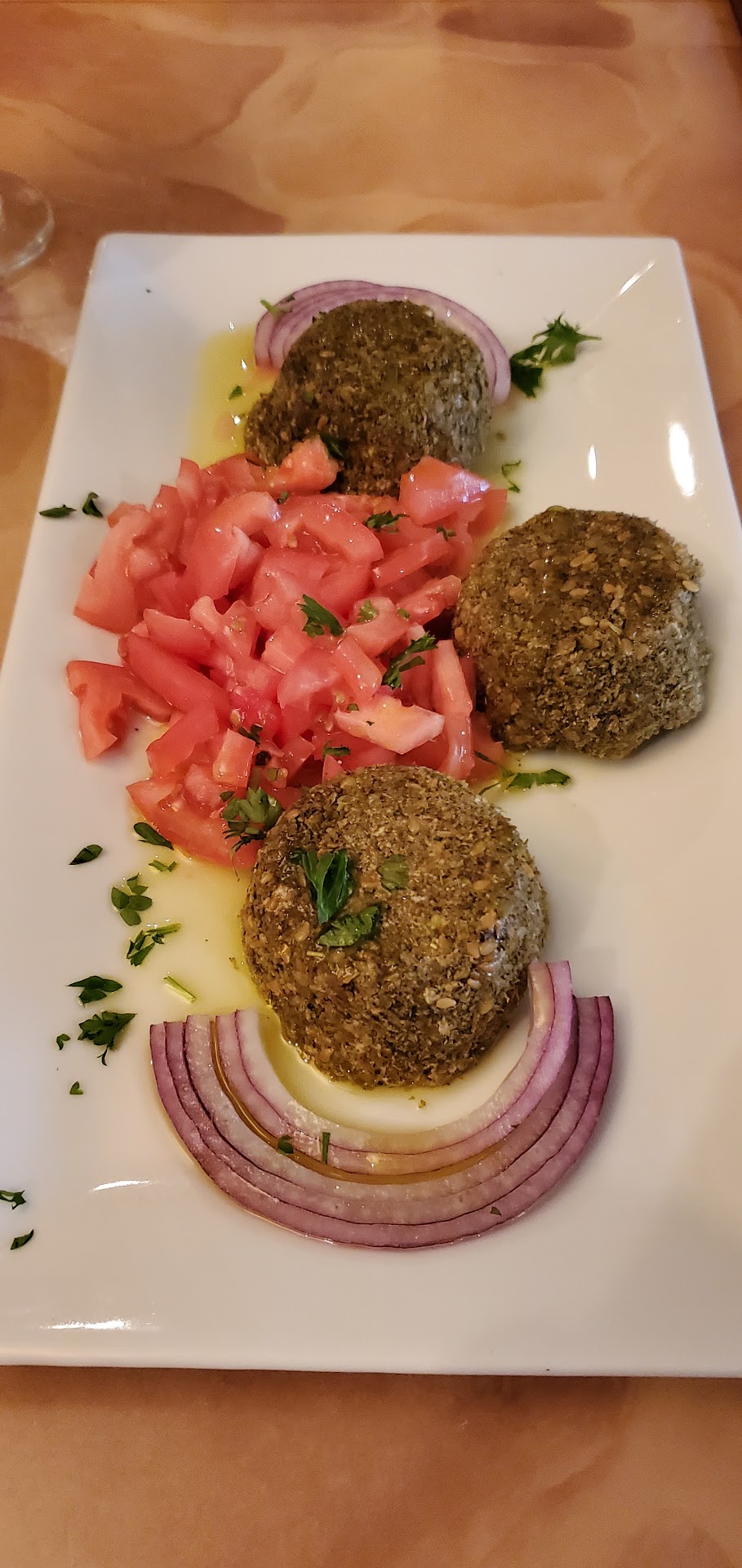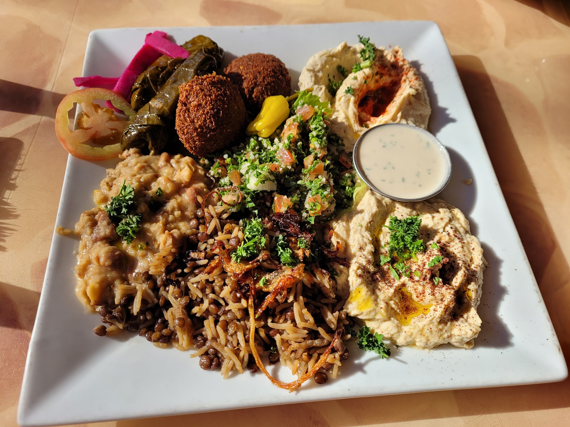 This is a long review...BUT A MUST READ! On my around-the -world food journey, we found this Mediterranean spot in Alexandria. We originally planned to go to a Greek bistro but it was closed (I must make mental note to check these places before I plan to go) but walked a few blocks and found the Pita House. I must say the service was top notch. Our server Abl gave us the best service ever (even better than chik fil A). I told him about me and my friend's food journey and he gave us appetizer (Combination Platter), entree (Mix Grill), and desert (Baklava) recommendations. They were all perfect 10s. The Combination Platter came with the juiciest salad I've ever had. It had a Lebanese seasoning and i think vinegar dressing (very very good). The hummus was good but ya'll it had Fava beans (Yes the ones from silence of the lamb). They were soooo good. The falafel was nice and crispy. If i didn't know it was a vegetarian dish, i would swear it had meat in it. It was also very tasty. For my entree I had The Mix Grill. It was a combination of lamb, chicken, and a sausage like item (I forget what he called it). I couldn't choose which one was best. The sausage had a lot of flavor but the chicken was moist and full of flavor too. The lamb was so tender I cut it with a butter knife. It came with rice and two sauces (a garlic and yogurt sauce-i search for a recipe at the table). I usually eat my rice with some type of gravy. But this rice didn't need any. It was flavorful just plain (how could that be)!! We finished up this meal with Baklava. I've had this before from Greek restaurants, but this one was different. The Greek versions I've had (although very good) is very sweet and rich. This version is just the right amount of sweet. Folks when I tell you this food was good...IT WAS GOOD. I am a novice when it comes to food. So I can't attest to how this food taste opposed to if you were in Lebanon, but I recommend this for anyone who likes food. Great food and service...what more could you ask for...good prices. My meal with taxes...