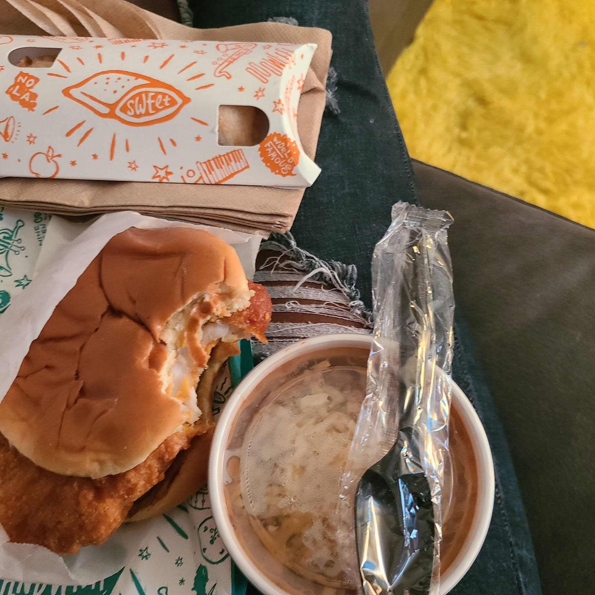 I finally tried the famous Popeyes spicy chicken sandwich. It was a very good fast food chicken sandwich. However, we did have inconsistent customer service with mixed reporting about the wait-time. Initially, I was informed the sandwiches wouldn't be ready for 15-20 minutes. I ordered chicken fingers instead. However, the sandwiches ended up being ready before the chicken fingers. I was served one...but was offered a side I didn't want in lieu of a partial refund since the chicken fingers were more expensive. The employees had good intentions, but this felt a bit inefficient.