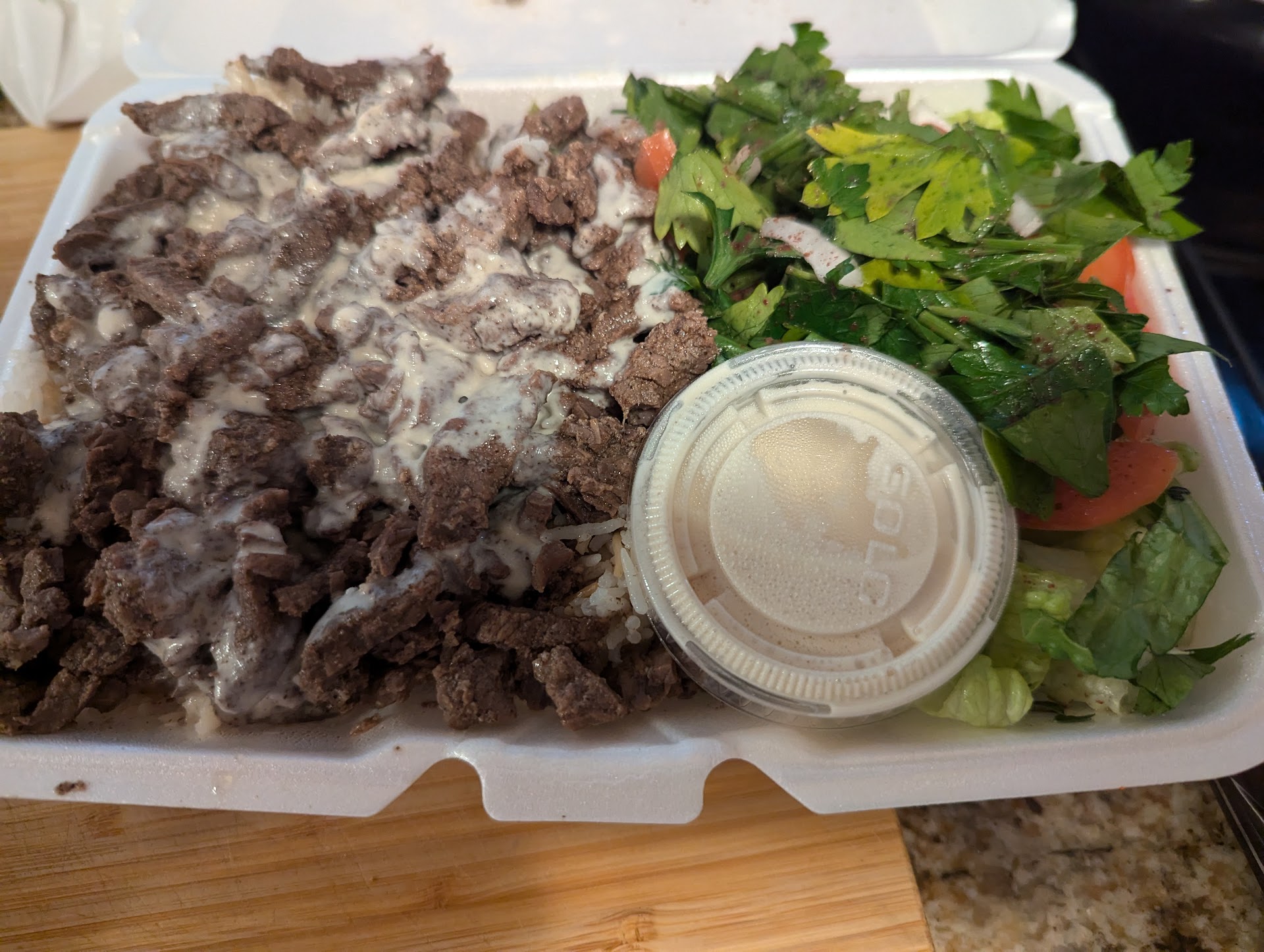 The spices on the chicken did not work for me. They gave the chicken an odd flavor that I did not enjoy. I've had chicken shawarma before, and it tasted nothing like this. And the chicken was served with this odd sauce that tasted like garlic flavored crisco. It was gross.