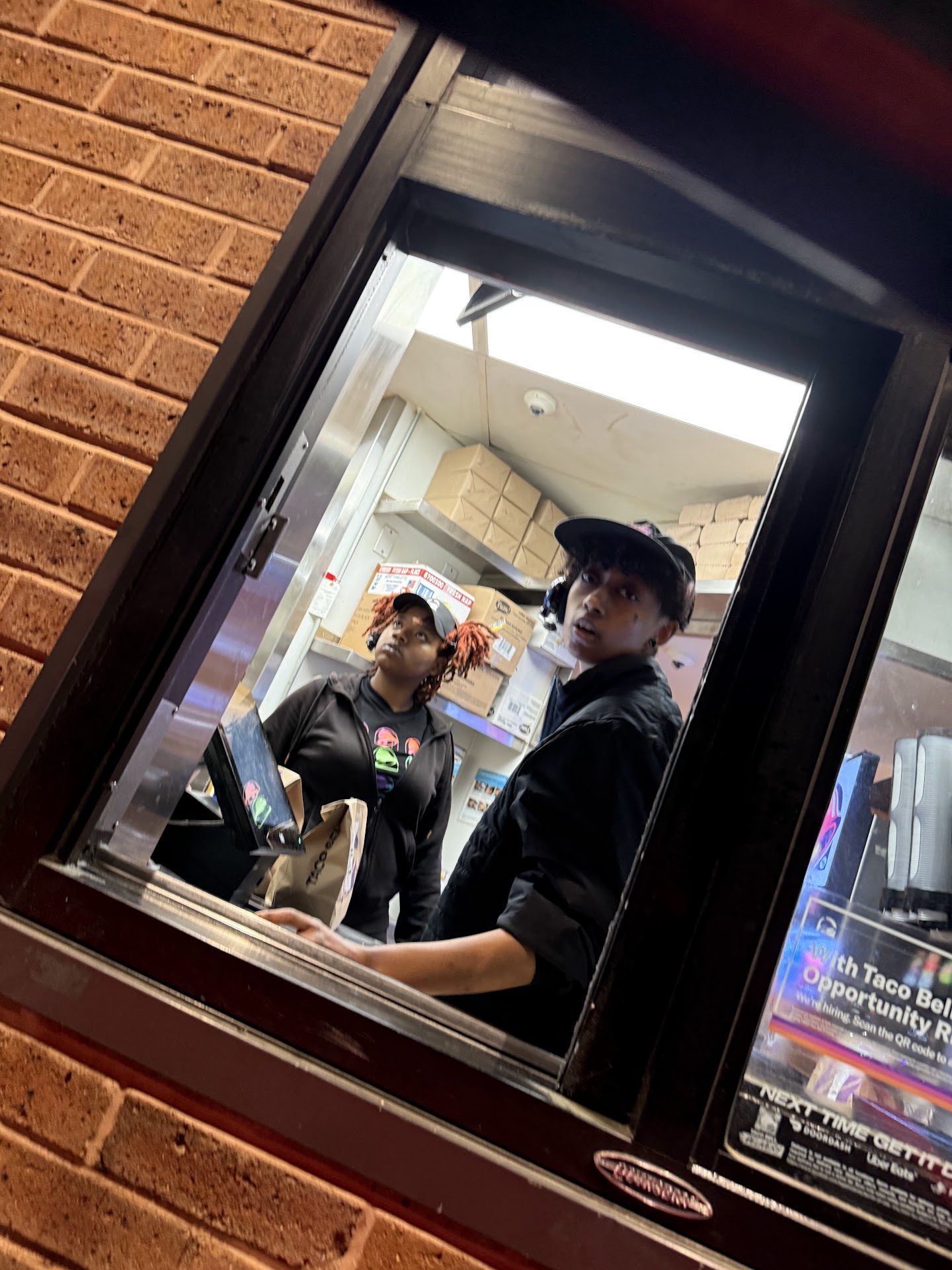 Read moreJust wanted to say thank you to the gentleman (manager maybe or should-be manager) working today at about 6pm. Some guy walked backwards away from the order stand and nearly ran into me as I approached the counter, I moved out of the way as he started walking back, which hey stupid behavior but whatever, I then attempted to walk around him to grab my take out order, but then he turns to me and starts yelling for ME to watch out etc. I imagine this guy is a jerk everywhere he goes, so I responded to explain HE was being rude and in fact walking backwards across the isle is inconsiderate and he needed to watch out for himself. Ironically, I would have apologized just to be polite even though he was in the wrong if he didn't start yelling. He continued yelling like he was the king of the world although he is clearly a person who is inconsiderate always the victim I'm sure this world is so mean to him. He had another staff member assisting him with the kisok so perhaps I am in the wrong for yelling at someone with a mental decifit twice my size because seriously its a kiosk you shouldn't need a babysitter to use the technology. Anyways, the manager was kind enough to walk me to my car away from this mentally impaired guy. It was a very strange situation and I did escalate it by standing up for myself I suppose I could have cowered away like he is used to people doing. I don't think there is a clear way to respond for the Taco Bell staff, but I really appreciate the staff member who spoke to me for having any concern about it. So thank you! To all potential customers though it may be faster to go inside maybe stick to the drive through guess I found the bad part...