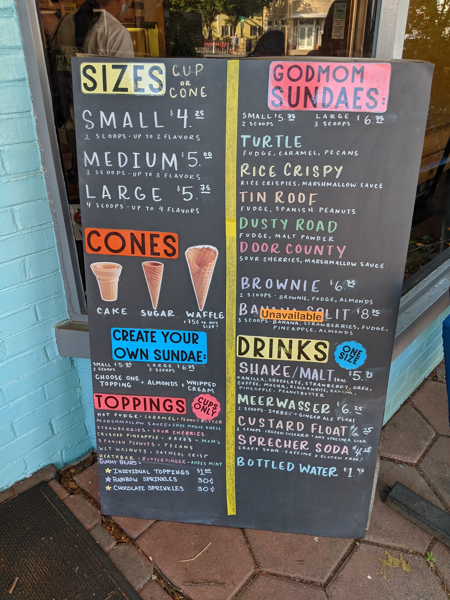 The sundaes make me want more. My favorite is the Door County, which is frozen custard topped with marshmallow sauce and sour cherries. The cherries are just tart enough to offset the sweetness of the marshmallow and custard. Tin roof sundae is also a good choice. You can never go wrong with peanuts and chocolate.