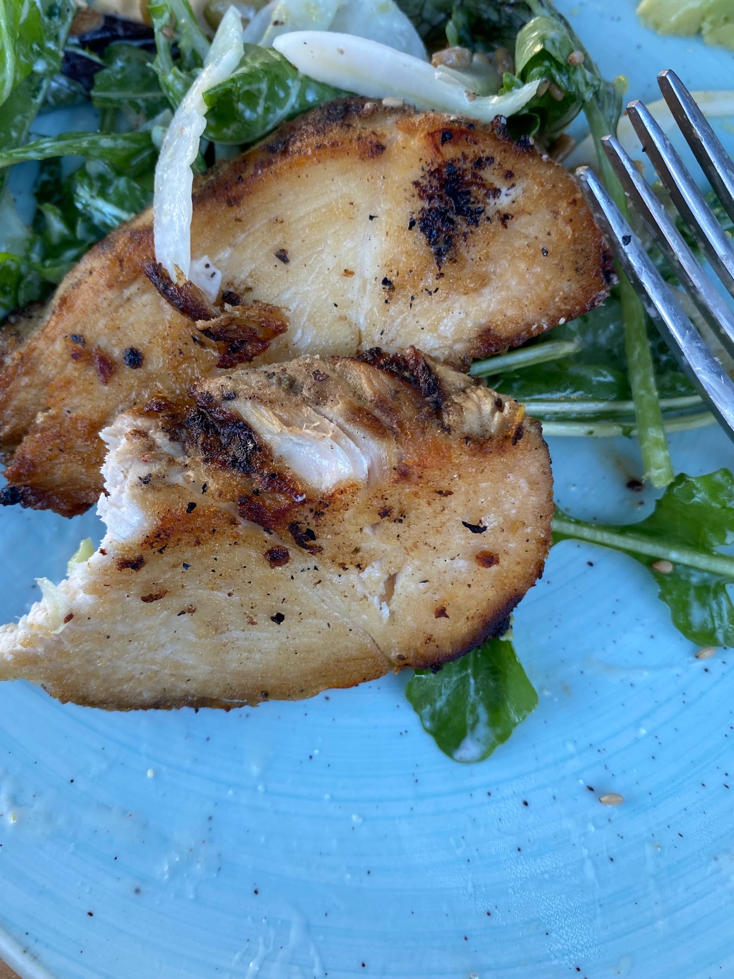 The chicken on this salad looked like a crostini. It had been cooked, microwave and doused with gamma rays. See pic.