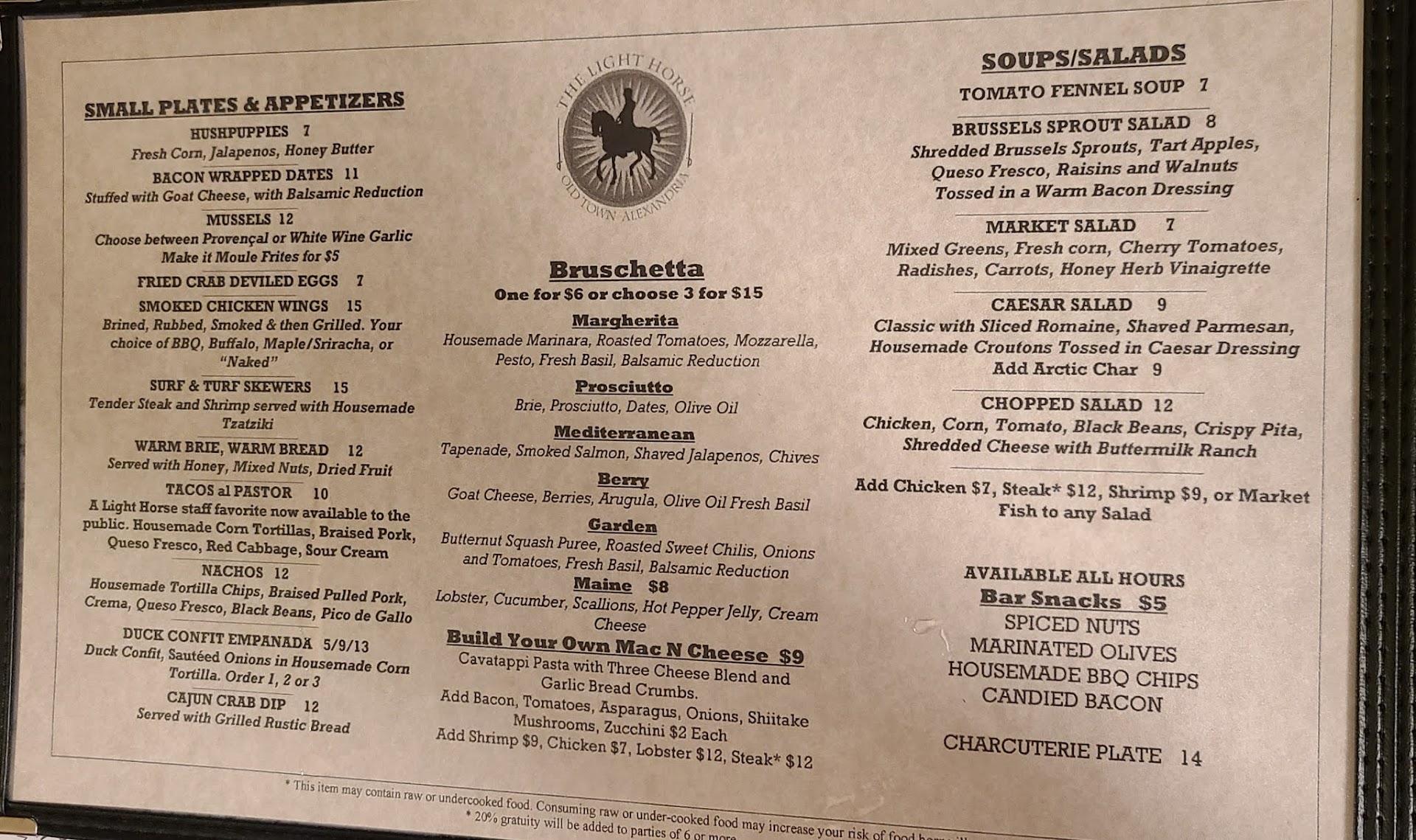 As usual for a Friday night, most of the restaurants in Old Towne were jammed up with anything from 15-45 minute waits for walk-ins. We stumbled upon Light Horse and there was no line and the menu looked good. The surfeit of free tables at a restaurant in Old Towne on a Friday night should have been a clue, though.