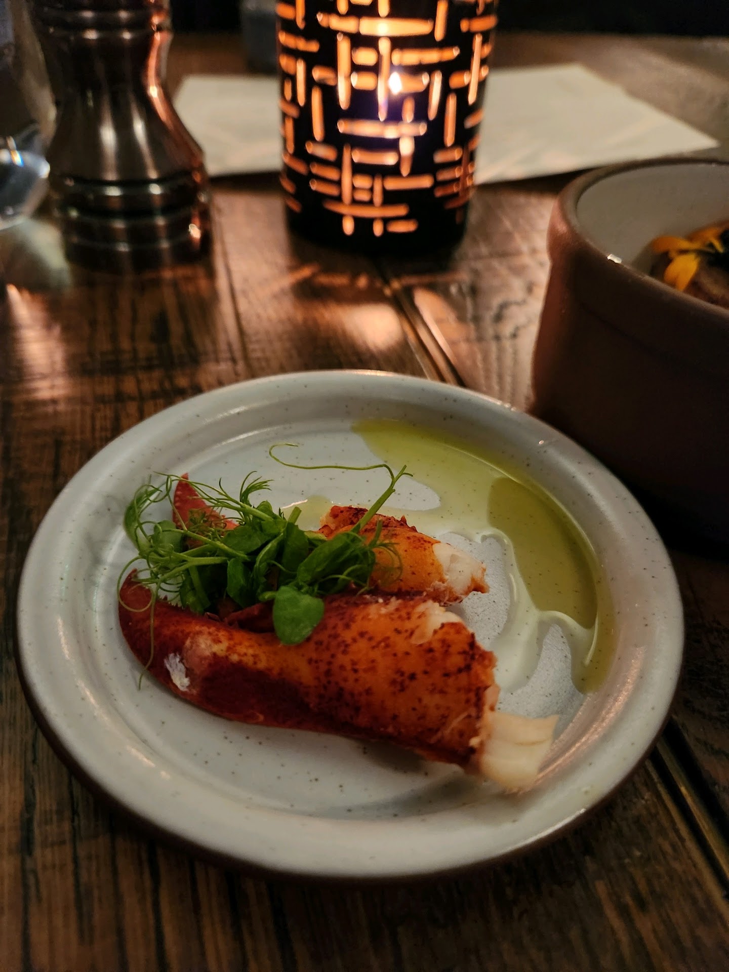 The lobster potato dish was very small in portion size, but was one of the best dishes. The lobster claw seemed like an after thought. There was no buttery flavor and had an overcooked texture. It came on a plate with some wilted micro greens. You'll see these greens on everything. The potato came with a little scoop of caviar in a very flavorful broth. It truly wasn't just a potato but that's what I'm calling it. This was my favorite dish of the night. I would order it again and ask to pay more for an entrée size portion.