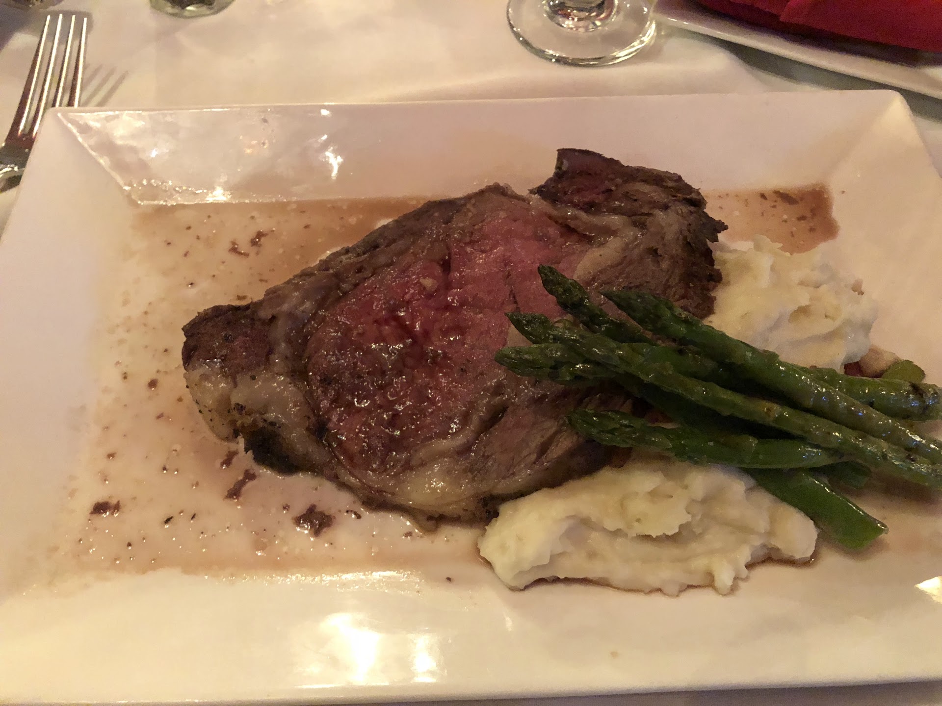 We dined at 219 on Christmas Eve after attending mass. Upon arrival, the hostess station was vacant, but she soon popped around the corner and showed us to our table, which was in front of the fireplace per the reservation. The ambiance is the best thing going for this place. The dining room is elegant; the fireplace is warm, and the large windows offer a splendid view of King Street. The bar is opposite the fireplace, though there was no bartender present. At first the room was very quiet, but toward the end of our meal, four dozen patrons were seated at the bar and the situation was rapidly changing. As for the meal... I had read on several reviews that they do a limited fixed-price menu (or a âprix fixeâ for the French wannabes among us) on New Year's Eve, but I did not expect it on Christmas Eve. Silly me. There was no mention of it on the restaurant's website. And the only note on the confirmation email was that reservations are only accepted for the main dining room. Let me tell you how awesome it is to show up with a family of six and find that the only option is a $48 per person three course meal. Apparently the unwritten rule is that meals for kids 12 and under are half price. So now I only have to pay $24 each for a meal they won't eat. Here I am, in that awkward position of having made a reservation based on the current online menu, only to find that Iâd basically RSVPâd to an exclusive event. We asked that, given the lack of notice on the website, if it would be possible for the kids to eat off the regular menu. Our server replied that it was probably doable, but of course for the same price. We had already ordered drinks and were about to cash out and roll the dice somewhere else when our server returned and informed us that the owner said the boys would be able to order cheeseburgers ($14 adult cheeseburgers, of course, not kids' cheeseburgers as would have been available in just about any other restaurant in Old Town). I ordered the chestnut soup, prime rib, and cake. My wife ordered the kale salad, glazed ham and cake. We were both excited for some Cajun Creole food, but there was nothing Cajun on the Christmas menu. Three of our kids ordered burgers, but our ten year old is especially picky and was not particularly hungry. He was going to share some of his brothers' fries and hold off until we got home to eat something he actually wanted. Our server understood and departed. Then she came back and said the owner won't allow him to not eat; he must order something. So we said a bowl of mac & cheese would be sufficient. That ended up being a $14 bowl of mac & cheese that he barely touched. They had some drink specials--I'm not really sure what was special about them, certainly not the price. My wife had a bellini, which she enjoyed, then another. I had a Founders lager initially, then opted for the Kentucky Peach (kind of a Kentucky Mule) which was watered down. After that I stuck with water. The food arrived reasonably timely. 1st course: The chestnut soup had the consistency of thick gravy. They were pretty skimpy on the thyme cream. I didn't care for it. My wife enjoyed her kale salad, which was clearly the better choice. 2nd course: The prime rib was unimpressive. I've had better on a Navy ship on that rare occasion when the supply officer would treat the wardroom with steak and lobster (and that was terrible). My prime rib was barely a half-inch thick. If not the worst prime rib I'd ever had (though a contender), it was certainly the thinnest. The potatoes and asparagus were cold. The "au jus" consisted of splattering a tablespoon of drippings on the plate. See photo. Of course you expect a lot of fat with a prime rib, but there was only about 4 oz of edible meat in my cut. I'd say it was about an $18 steak at best. My wife ordered the glazed ham, which was fine, but not worth a fraction of what we were paying. The kids' burgers all came out medium rare to rare--not that we specified a level of doneness during our initial food negotiations, but who gives a 6 year old a...