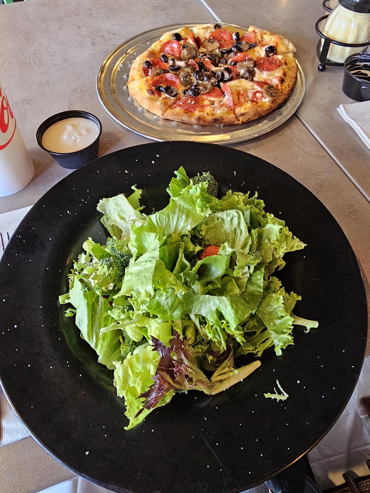 I ordered a side salad with the wild wood ranch (basic salad- basic ranch) and the cheese pizza.