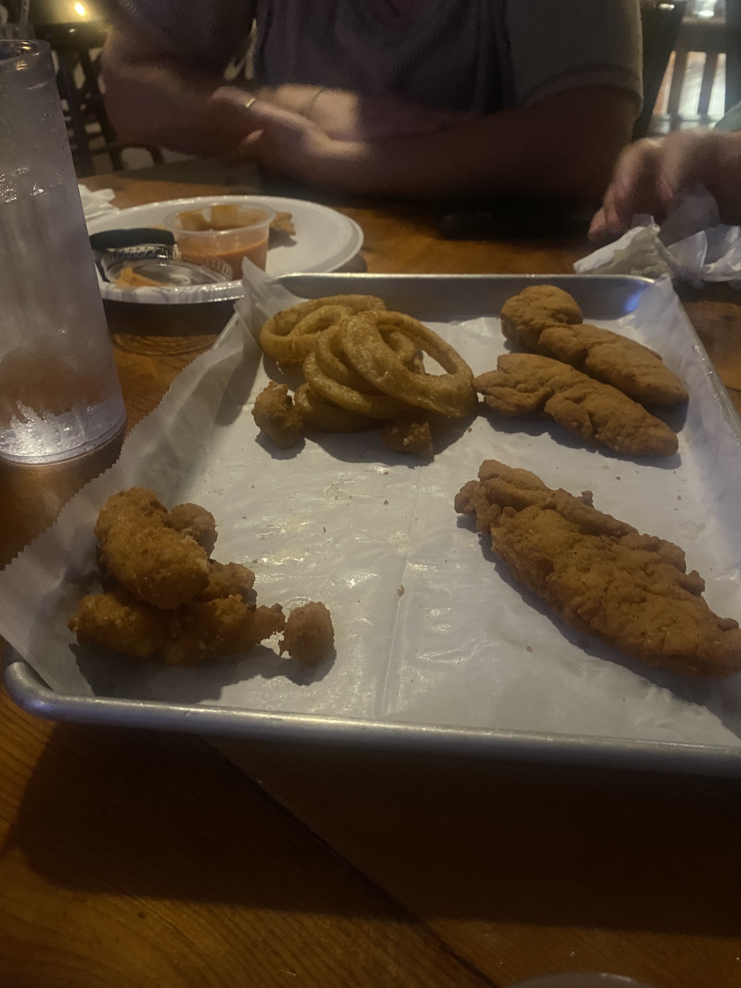 Came here for dinner while on vacation with friends based on reviews. I will say, if this place was just a bar without any sit down dining area, it would be a really cool bar atmosphere. We went to the dining area and our server couldnt hear our orders over the music, she also got really annoyed with us because of it and was rolling her eyes by the end of our order. We got our drinks (a mule and tequila soda) and couldnt tell what they actually were when brought to us, they were passed around the table and no definite conclusions were reached. They brought out the food fairly quickly, it was okay. Overpriced for what it was. We got a few wraps and the appetizer platter (pictured half eaten). While in the middle of eating our food, the lights in the dining area turned off. After a few minutes our waitress was kind enough to ask if we wanted the lights turned back on. Overall, I dont think I would come back for food but the bar area did look pretty popular and a good...