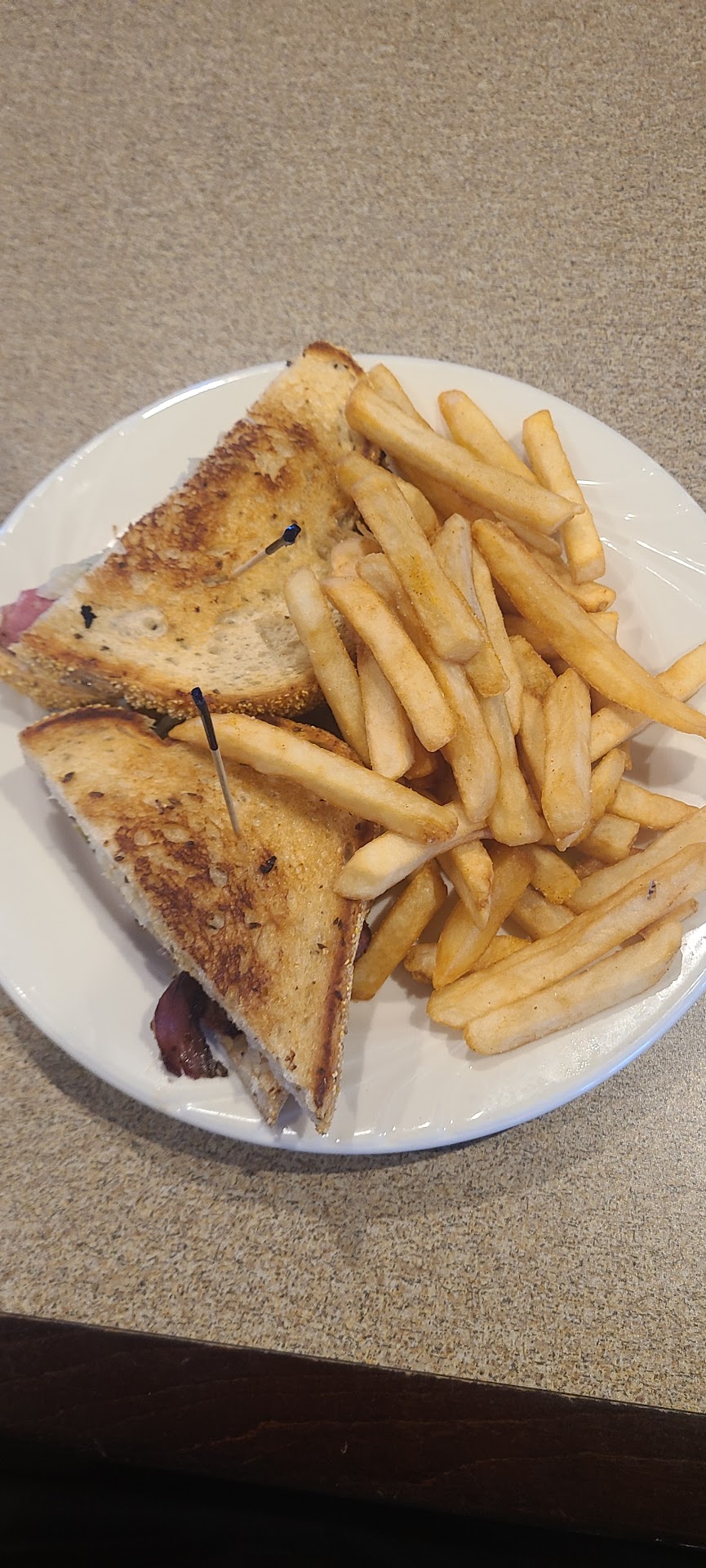 My craving for country fried steak has been bugging me for weeks now. Sister suggested this place. The country fried steak I ordered came with two eggs, cooked any way you like (I chose over hard) and hash browns. Mom chose 3 items from the build your own breakfast- two eggs, country potatoes and pancakes. Sister ordered from the sides- french toast, 3 bacon strips, and onion rings. Son got the tuna melt that came with a choice of side, he opted for onion rings. Then we also ordered biscuits and gravy. The food was ok. Biscuits and gravy tasted better than the last diner we visited, but my search for a good country fried steak continues. Our server Denise was nice and attentive. Inside was a little warm but it had a nice view of the golf course. Restrooms are outside but clean. Parking is somewhat difficult as it is shared for the golf course and other...