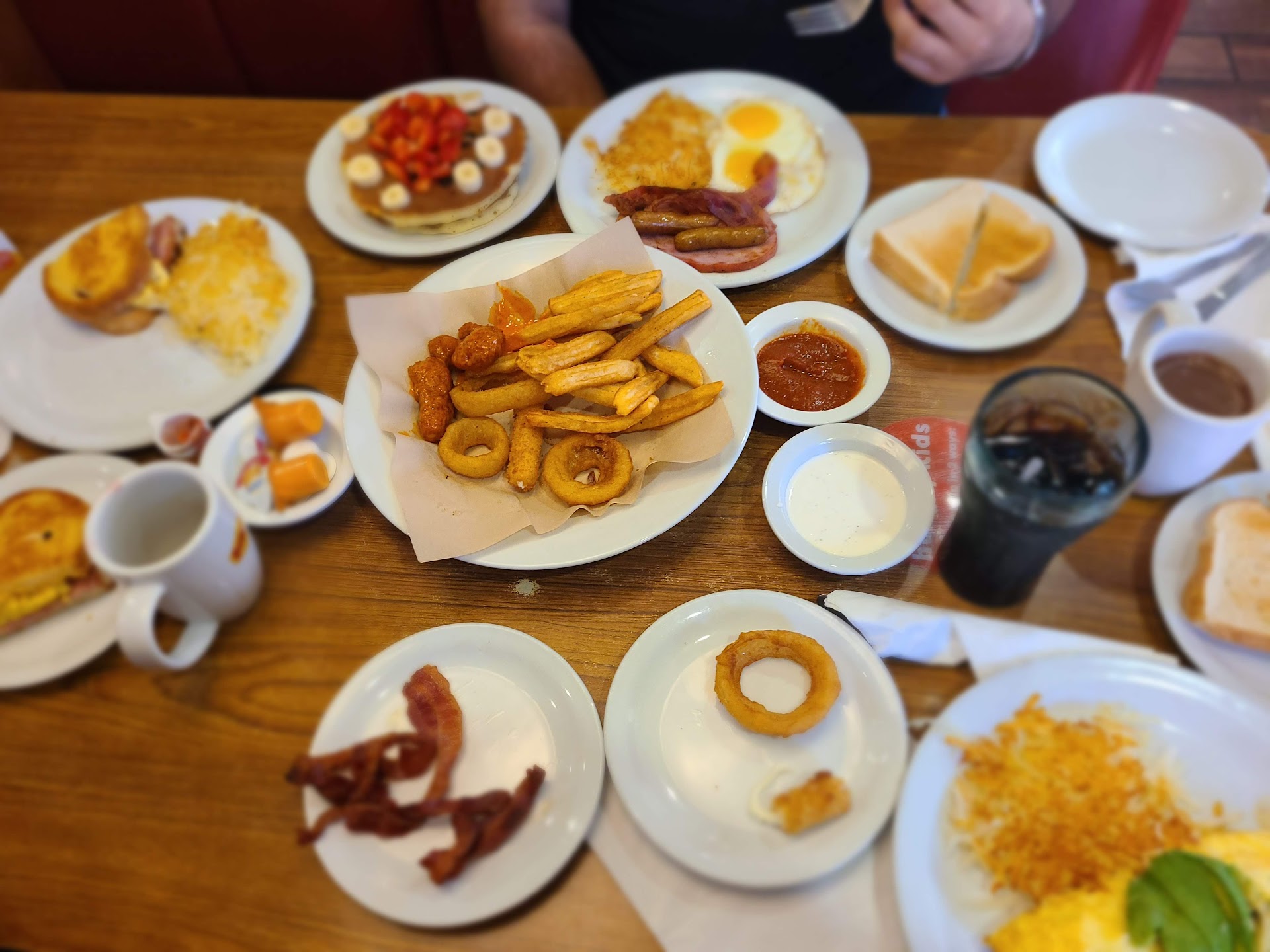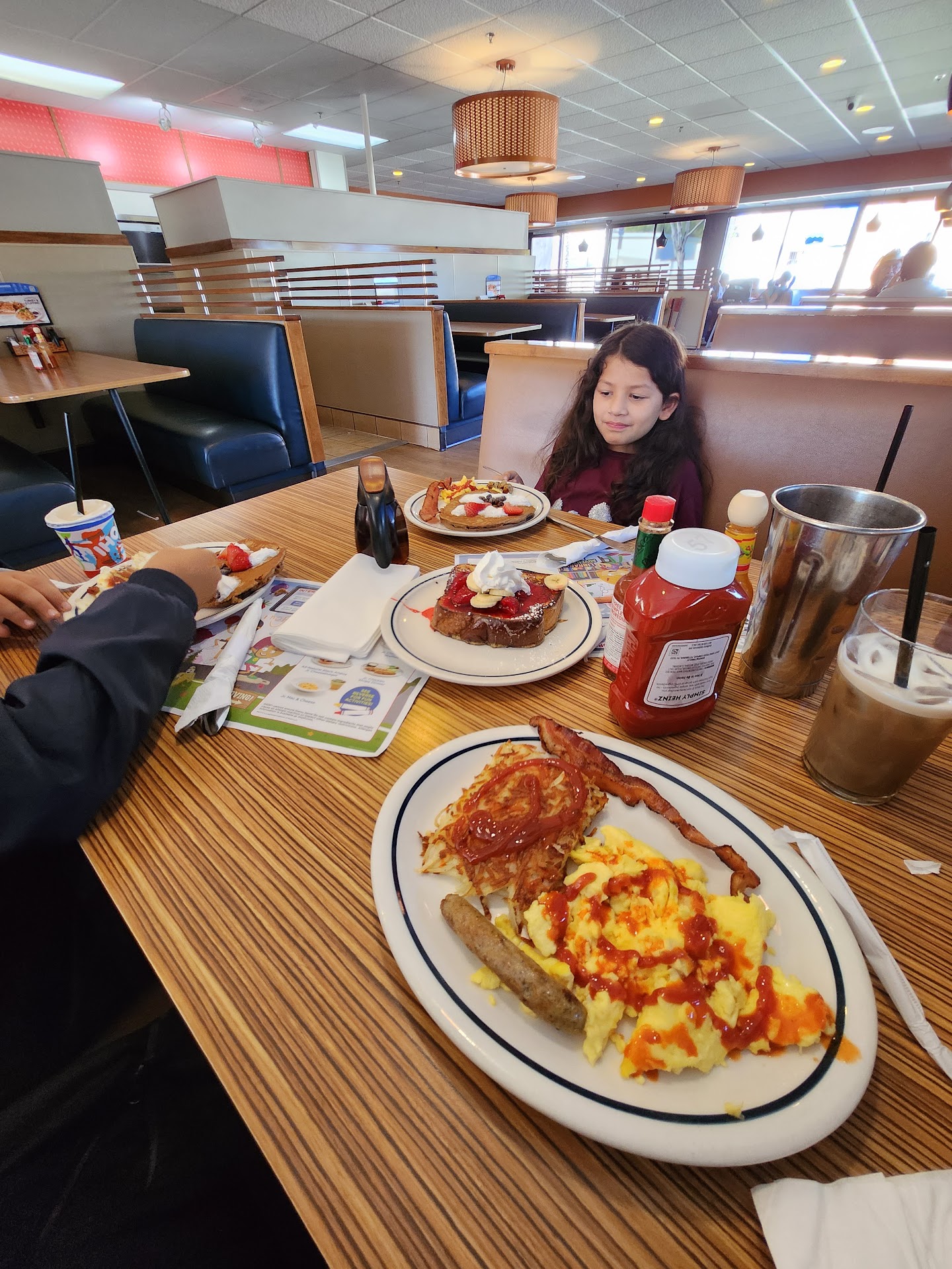 Came in for breakfast. Feels a bit dark and dingy when you walk in, But we were greeted quickly so we put in our name to be seated. They said it would be just a couple minutes...After about 15 minutes we went back up and asked how much longer it would be and they seemed confused as to who we were. After a little scurrying around they quickly took us to one of the empty tables.We sat there for about 10 minutes with no one coming to help us. Finally someone came by as we're about to get up and walk out and asked if we wanted anything to drink. From there...things were only slightly better. We ordered and got our food fairly quickly. ..but..had no utensils so had to wait and ask for those. Then.. asked for syrup and jelly, but served brought ketchup and sugar. Food was ok.. not great. We asked for our check. Server brought our check and another bottle of ketchup (?!?!) One thing of note: the place is SERIOUSLY run down and filthy (see attached photo) Tabletops are worn walls are dirty the blinds have food and catch up stuff to them and the floor next to my table had old math and food piled up on it like it hasn't been slept in years.Unfortunately when I dropped my phone and resend the pick it up that's what my hand fell into. Pretty damned disgusting. That's the photo you see in this review. Needless to say - we...