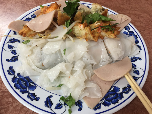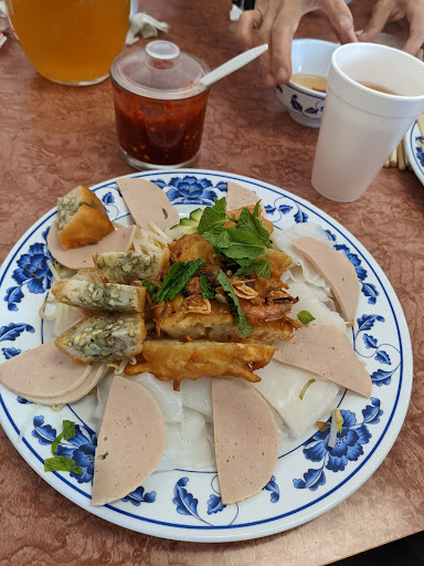 This is translated to three type (shrimp powder, ground pork and mushrooms) flour sheet combination with two type of shrimp tempura (1. fried mung bean and shrimp ball, 2. fried sweet potato and shrimp) and pork cake (cha). The ratio between flour and filling was so bad!!! Just sprinkle of shrimp powder (not even ground shrimp like the menu stated) and basically no ground pork or mushroom. The filling is my favorite part of banh cuon! You would get way more filling in the banh cuon at Banh Mi Che Cali. This is a pathetic version. The mung bean and shrimp ball was basically all mung bean and 1 small shrimp. The sweet potato and shrimp tempura was good. The fish sauce here tastes like vinegar and sugar. Even if you dumb a bunch of chili paste, it doesn't hide that sweet taste. My dad asked for lemon and received only 1 slice. Not sure how this place is still in business when they skimp on everything. Will never, ever come...