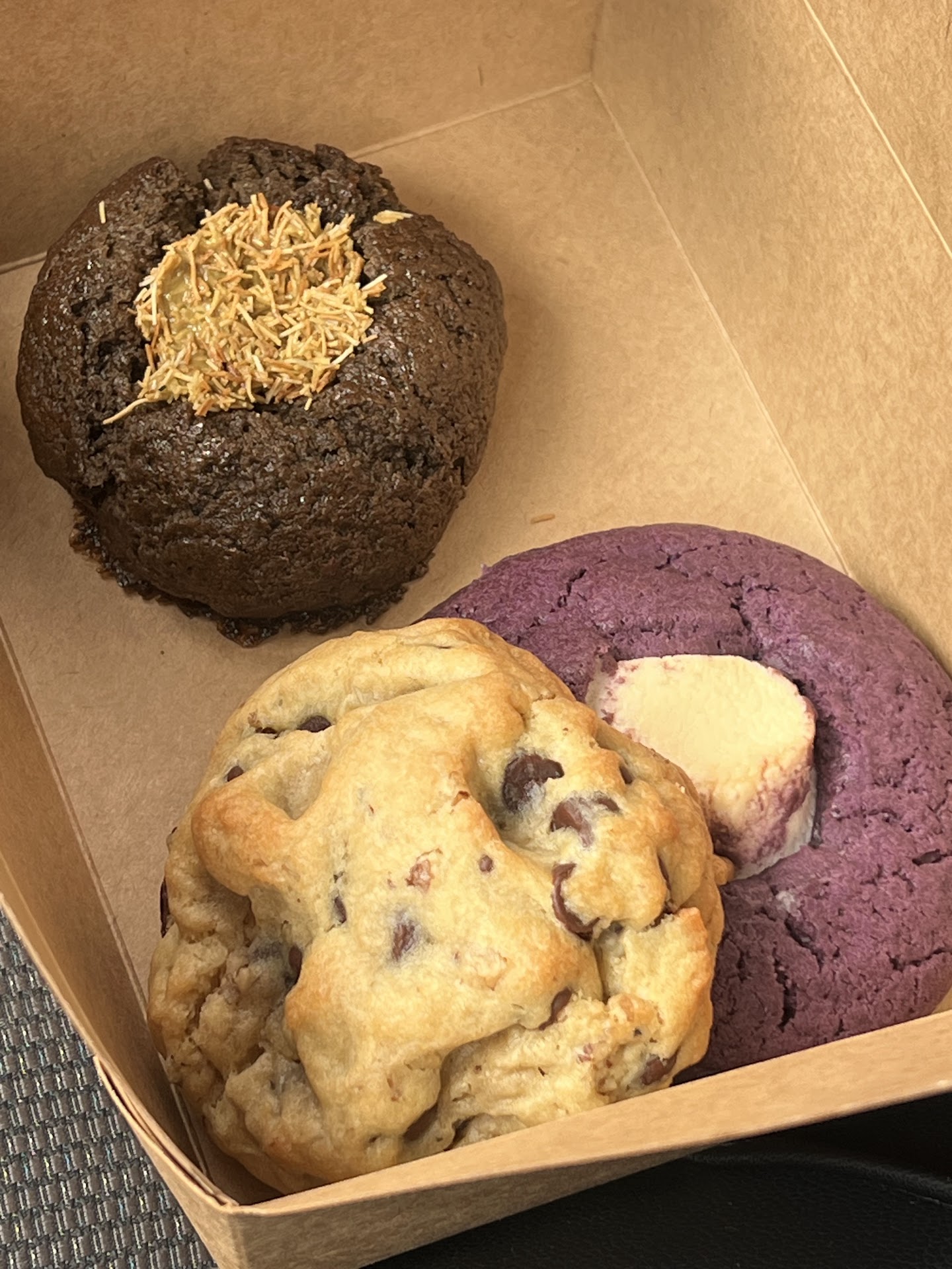 I purchased the Hojicha Piscatchio Scone, the Ube S’mores Cookie, and I believe it was called the Messy Cookie. Also purchased an Americano.