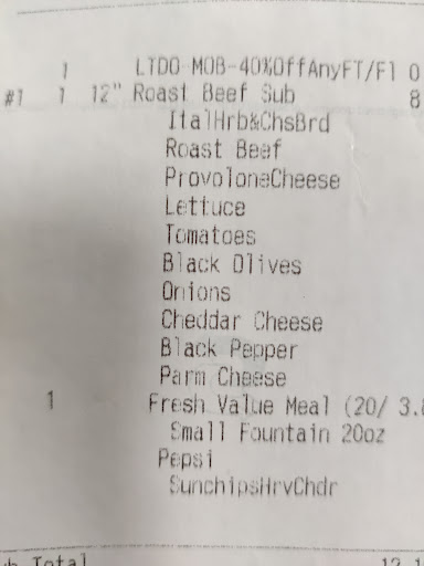 Read moreOrdered a Footlong Roast Beef and Sunchips and 20oz drink through the mobile app. When I arrived a 60-70 year old female employee gives me a bag. I said I also had chips and a drink. She said the chips were in the bag. But said I did not order a drink. I show her the reciept taped on the bag where it shows 20oz fountain. She gives it to me without even saying sorry. The nicer gentleman working with her apologized for her. But she just acted like she did nothing wrong. Just looking at how the reciept is written, it makes no sense how she saw the Sunchips but not the 20oz fountain drink. Upon eating the sandwich while typing this review, I noticed that the bread was not even toasted. And while I was eating and observed other customers ordering their food, I noticed that they do not accept Credit Card for some reason or another and forced everyone to pay in cash. The last time I was here I found plastic in my food, which they did replace the order. But still it shows that this location is getting worse and worse every time...