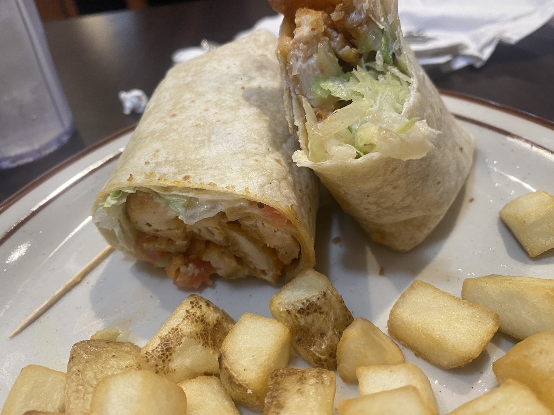 My wife ordered the Fried Chicken Bacon Club with fries. She said the flavor of the club was good, but the chicken was overcooked and somewhat dry. After a few bites of the fries she decided that they weren't worth eating. She said they tasted like they were fried right after funnel cake was made in the same oil.