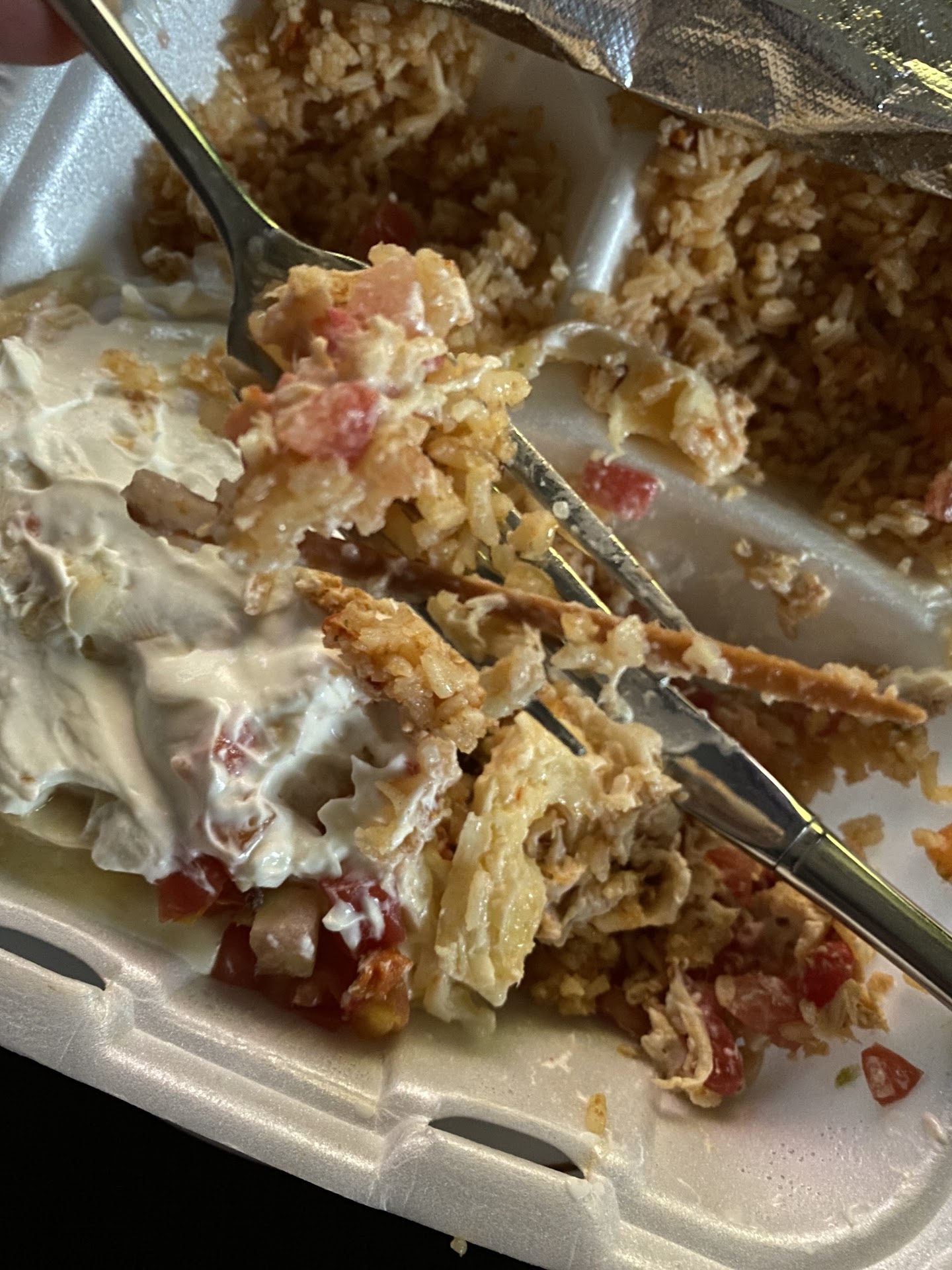 But the last THREE times that I have ordered takeout chimichangas from here, I have found a wooden toothpick skewer INSIDE of my chimichangas. Not on top. Literally inside, blending in with the chicken. The first time, the pick was shredded and I had bit down hard on it. It was painful enough that I had to schedule a dentist appointment. I couldn’t tell you how many slivers of wood I may have eaten that day, but I’m sure it happened if they were small enough bits. I saw it as an oversight and didn’t care to call and complain.