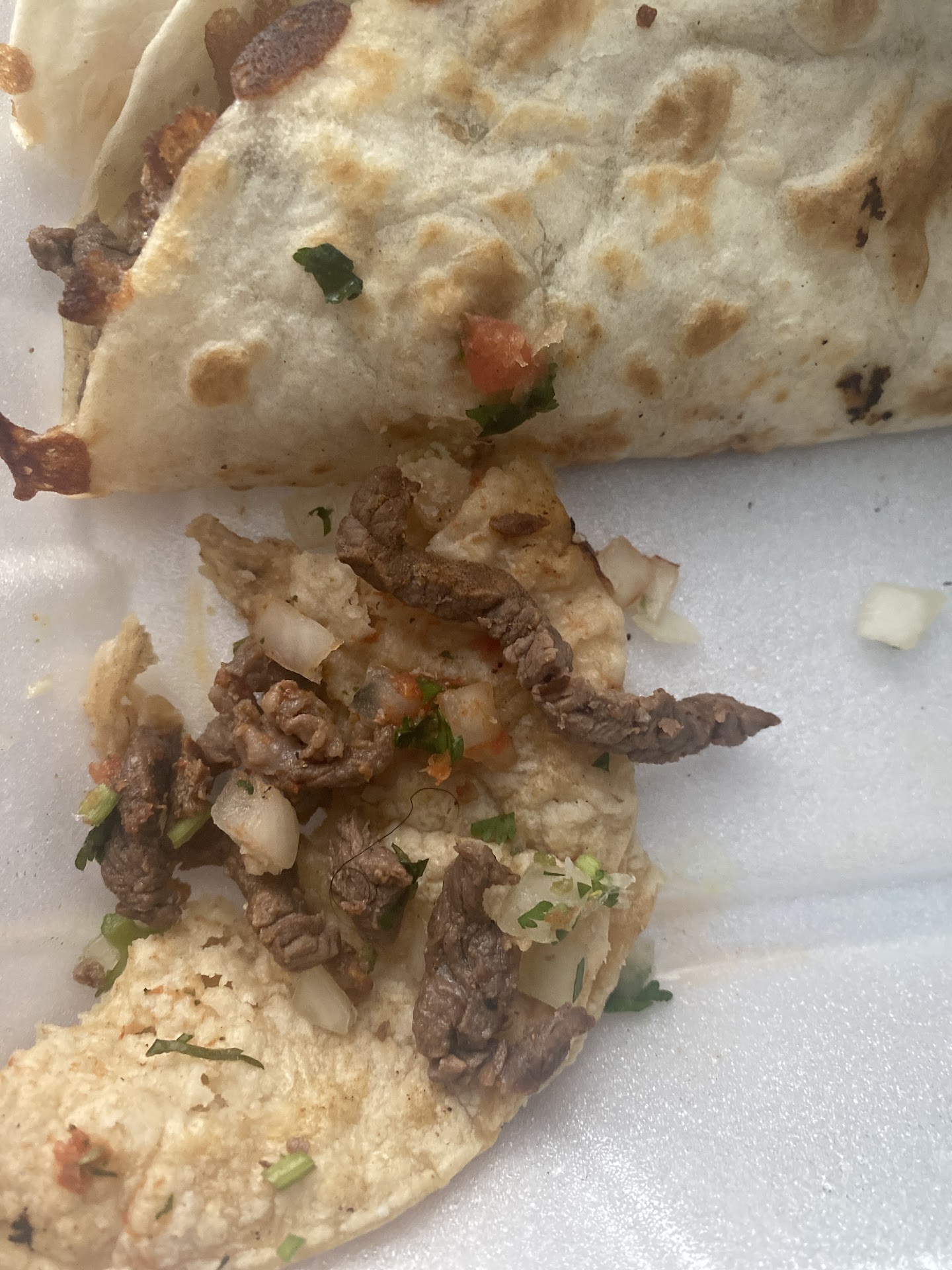 1 chicken taco 3 steak tacos 2 steak quesadillas chips and salsa 2 containers of rice...