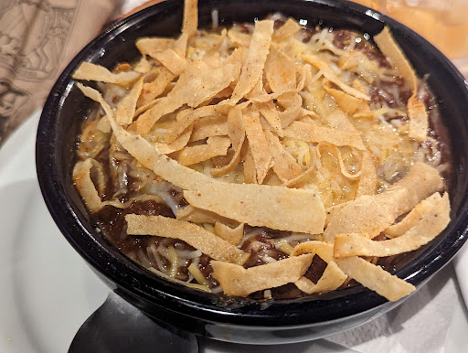 We ordered (steak for my partner, previously mentioned fajitas for me). Had the flour tortillas replaced with corn and I really wish I hadn't. When the tortillas came to my table, I thought I caught a whiff of, of all things, toilet urinal cakes. Figured I must have just smelt something weird off of someone near me, or maybe I was near the bathrooms, and loaded up my first tortilla. I put that should-have-been-delicious mess of steak and shrimp in my face and quickly realized that the toilet urinal cake was coming off of the corn tortillas. This says to me that this restaurant is storing their food items near cleaning items in the back. I have worked years in kitchens and have had OSHA food sanitation training. Chemicals are kept away from food because the smells and worst, the chemicals, leech out and into absorbent foods. I had my partner sniff/taste the tortilla to confirm that I wasn't losing my mind, and then had to flag a waiter to take them from my table because the smell became so strong that I couldn't eat. It was just another sign that I should have stopped and left, because we're still not done with this review. Thankfully, the fajita filling tasted alright. The beans were served in a runny mess, more liquid than bean, and partway through, I started to find random veggies. Some of it was clearly the pico de gallo, but other veg that weren't in that showed up as well. So I stopped eating the beans. And I had still another sign I should have just stopped eating everything.