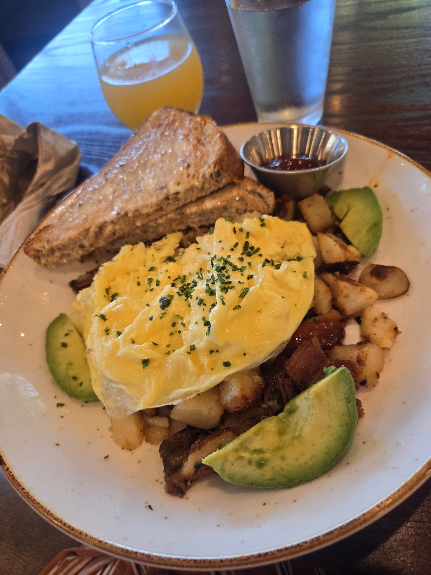 I ordered a seasonal skillet and it was amazing. Goat cheese, brussel sprouts, served with eggs to order over a healthy portion of hash browned potatoes with a bit of bacon. Loved it. My wife had the farmhouse style breakfast hash, which she really loves too. We ordered mimosas, and they were fine. Probably not worth ten bucks a pop, but sadly the don't have the option for a pitcher or carafe.