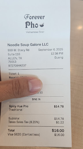 Read moreA good place for pho and family homemade food on Stacy Rd in Allen. A friendly and relaxing place to have quick lunch and dinner. They serve delicious pho noodle bowls, beef or chicken pho, fried rice and noodle dish and authentic Bun Bo Hey (Spicy Hue Pho). I came for a pho but saw they have a good looking bun bo hue. Gave it a try and it was good. Spiciness level at 9 but you can ask spicy level 5 or 6. I might have to come by for beef pho and summer shrimp rolls for full review. If you are Asian food lover, you find this place good with food Vietnamese and Chinese cuisine. Reasonable price and fast friendly service. Come by and check out yourself. The staffs are friendly, good server Sky and big shout to Duong, the chefs and family staffs. Good job keep Vietnamese to Allen community. Good food to enjoy but need improve cleanliness in restroom that would be 10/10. Highly recommend for visitors, local diner or Asian food lovers 🍜