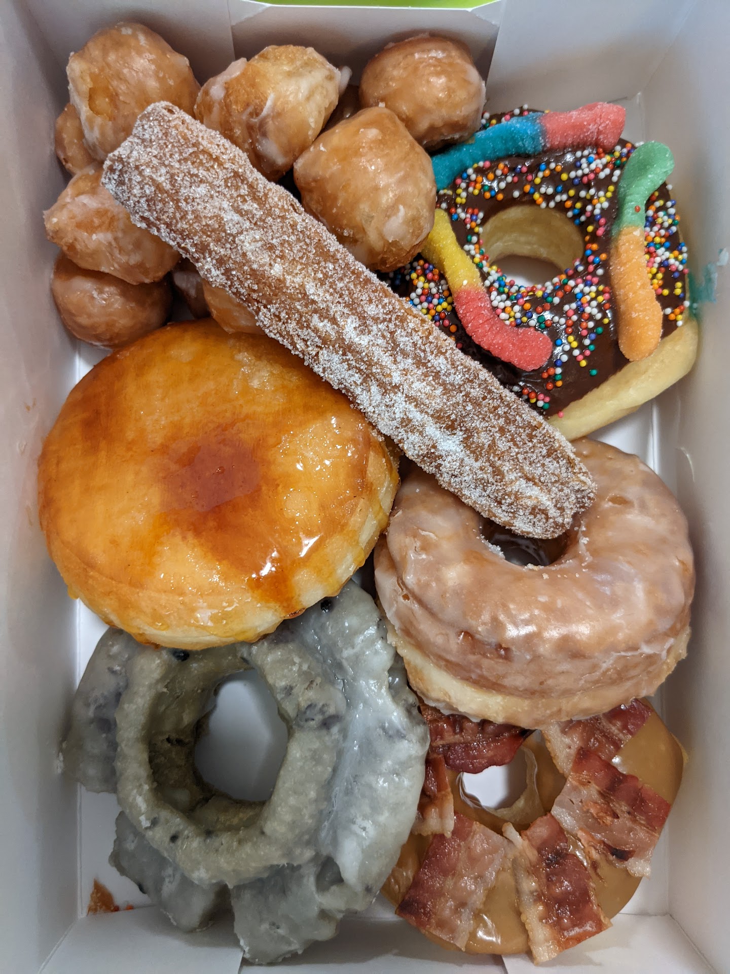 The variety is about what you'd expect but the one thing I really liked that I hadn't seen before was the mini apple fritters. They were a perfect size (2 bites), but had all of the flavor and feel of a full size fritter. All of the donuts we got were good though. Even later that day they still held up well.